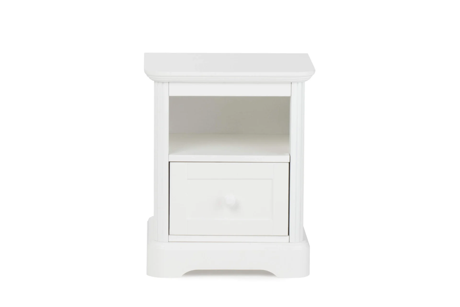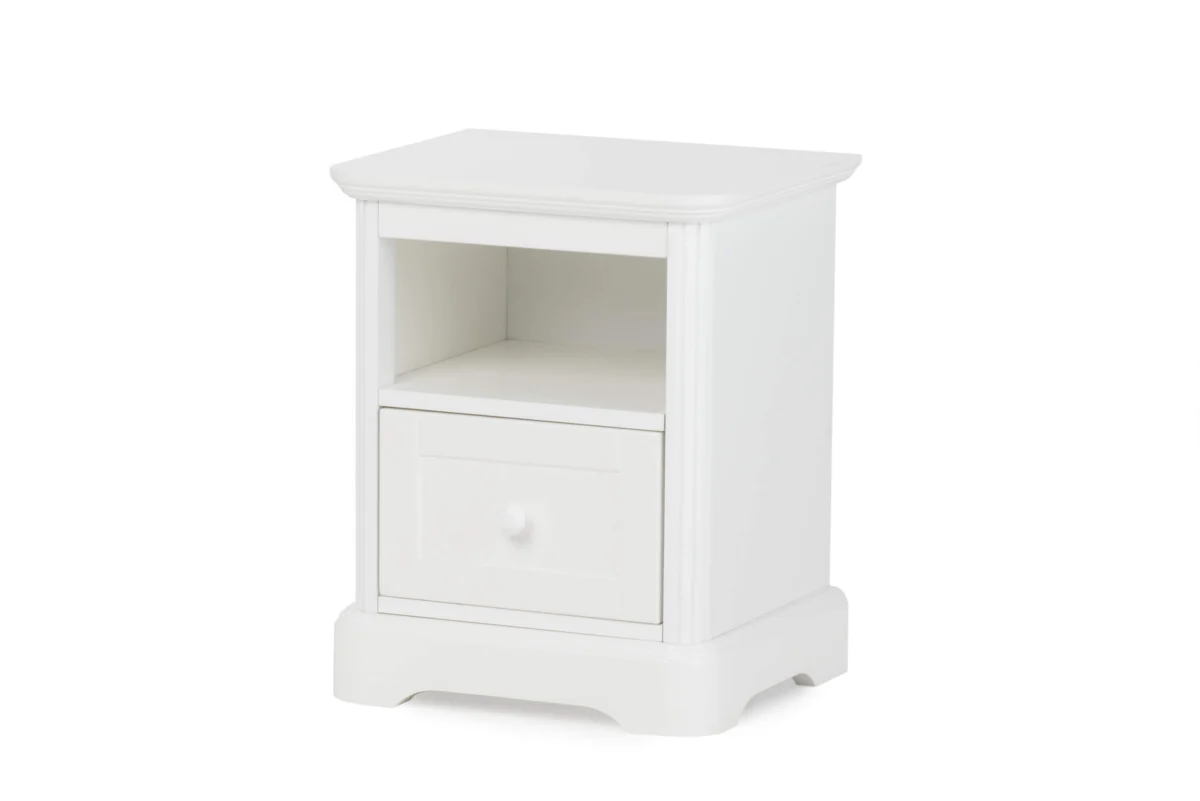 This bedside table in white matte color is made in the combination of chipboard and MDF. The drawer structure and the front part are made of white melamine chipboard. The structure plank top, the decorative base and the decorative moldings on the drawer are made of MDF coated with white primer foil.