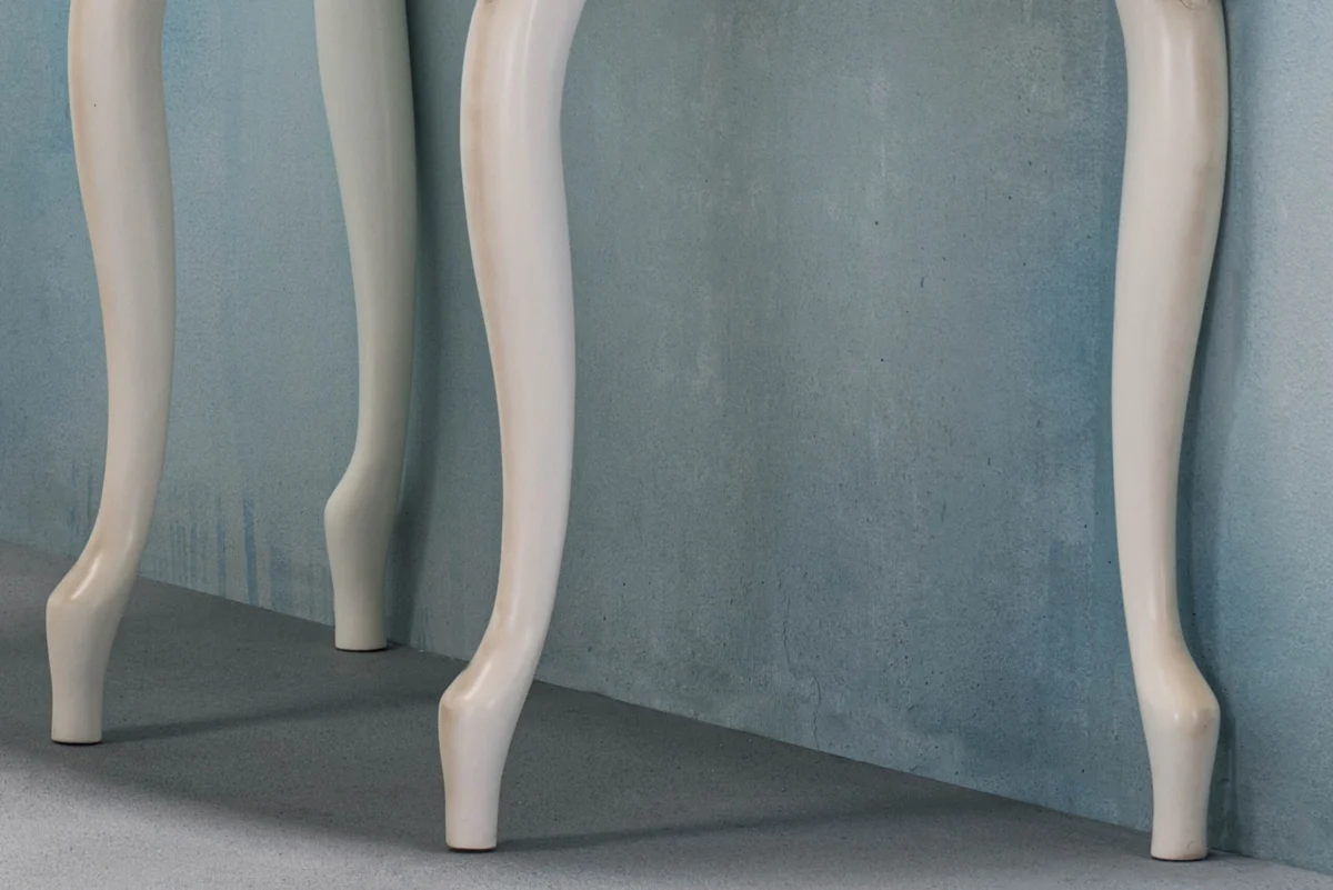 The Viktorija console table has a plank top of white melamine MDF with a white matte finish. The edges are profiled and shaded. Wavy legs made of solid beech wood are also profiled and shaded. The console table is the work of the finest handcraft.