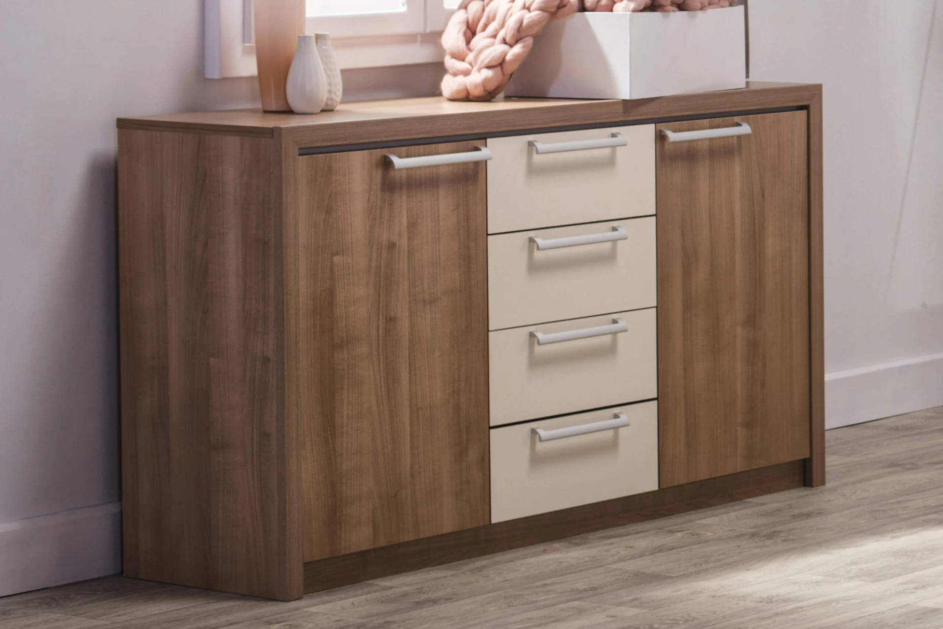 Keln dresser is a classic model that never goes out of fashion. It has four drawers and two doors, and plenty of space to put your clothes together nicely.
