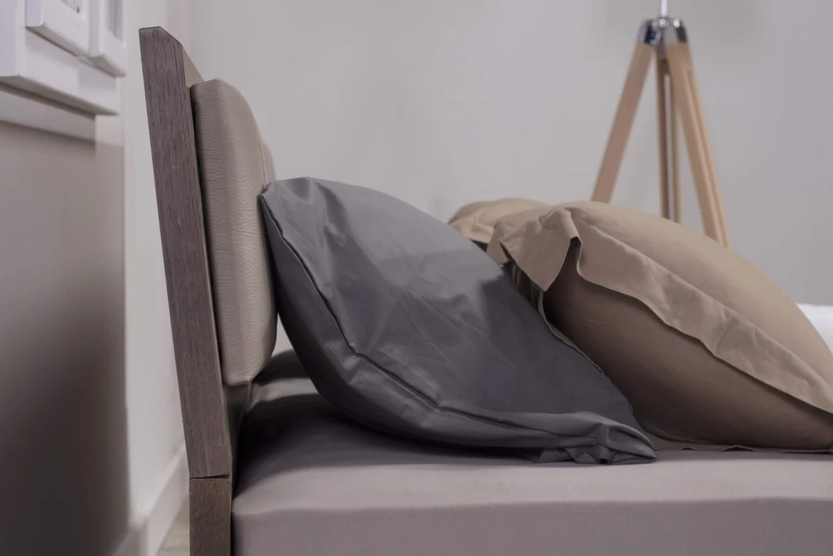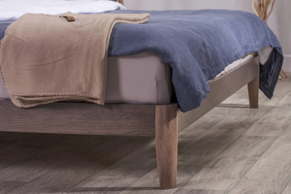The headboard is made of refined chipboard in a dark oak sonoma pattern. The bed box is made of plywood coated with oak veneer, toned and varnished to get the sonoma effect of dark oak. The legs of the bed are made of solid oak in the same tone and elegantly separate the bed from the floor.