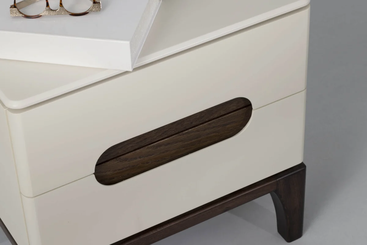 This bedside table is made of a combination of refined chipboard, MDF and solid wood. The sides are made of white melamine chipboard treated with PU varnish, in the tone of Bianco pearl. The panel and doors on the drawers are made of MDF in the same tone. Instead of handles, Alora has an interesting design solution for opening and closing drawers, made of veneered MDF in dark walnut color. The frame and legs of the stand are made of solid beech, in the tone of dark walnut.