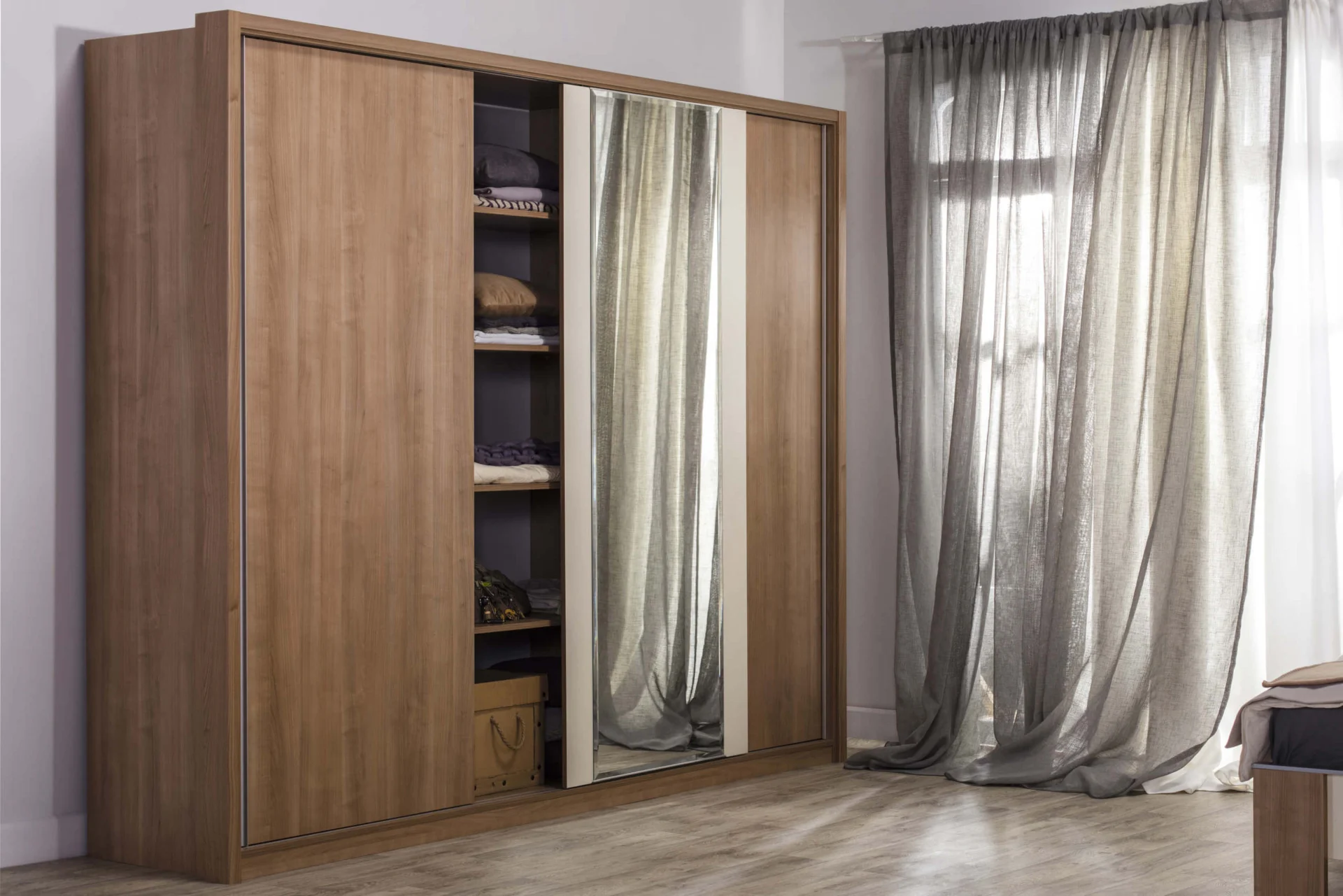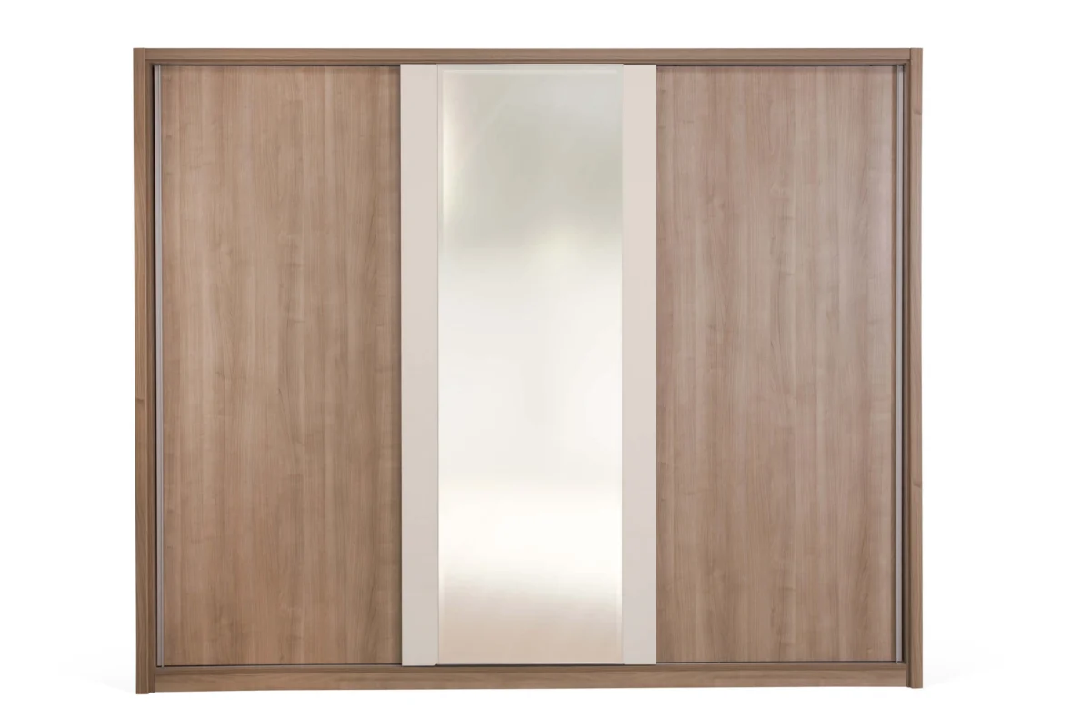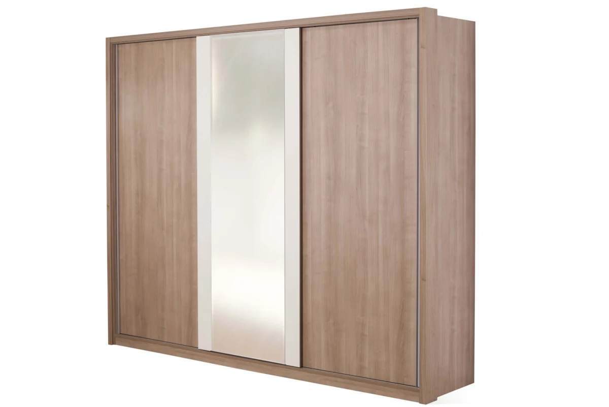Keln wardrobe measuring 272.6 x 61.2 x 223.7 cm is a three-wing model with sliding doors that can be with or without mirrors. The interior is divided into three parts. The central space has five segments. Spaces equipped with wardrobe bars are positioned left and right in relation to it. There is one large shelf above each wardrobe bar.