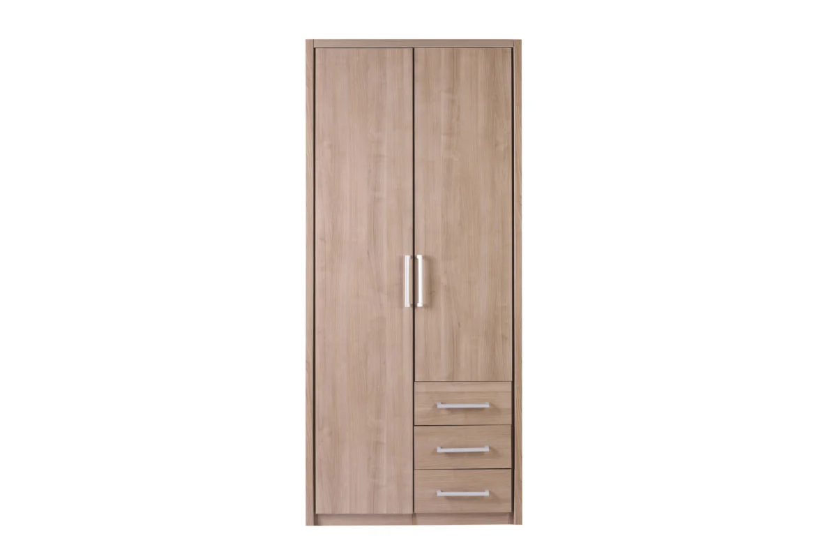 Keln wardrobe measuring 99.4 x 58.6 x 222.7 cm is a double-wing model with a classic door and three drawers. In addition to the drawer, there are four separate segments and a section with a wardrobe bar for storing clothes.