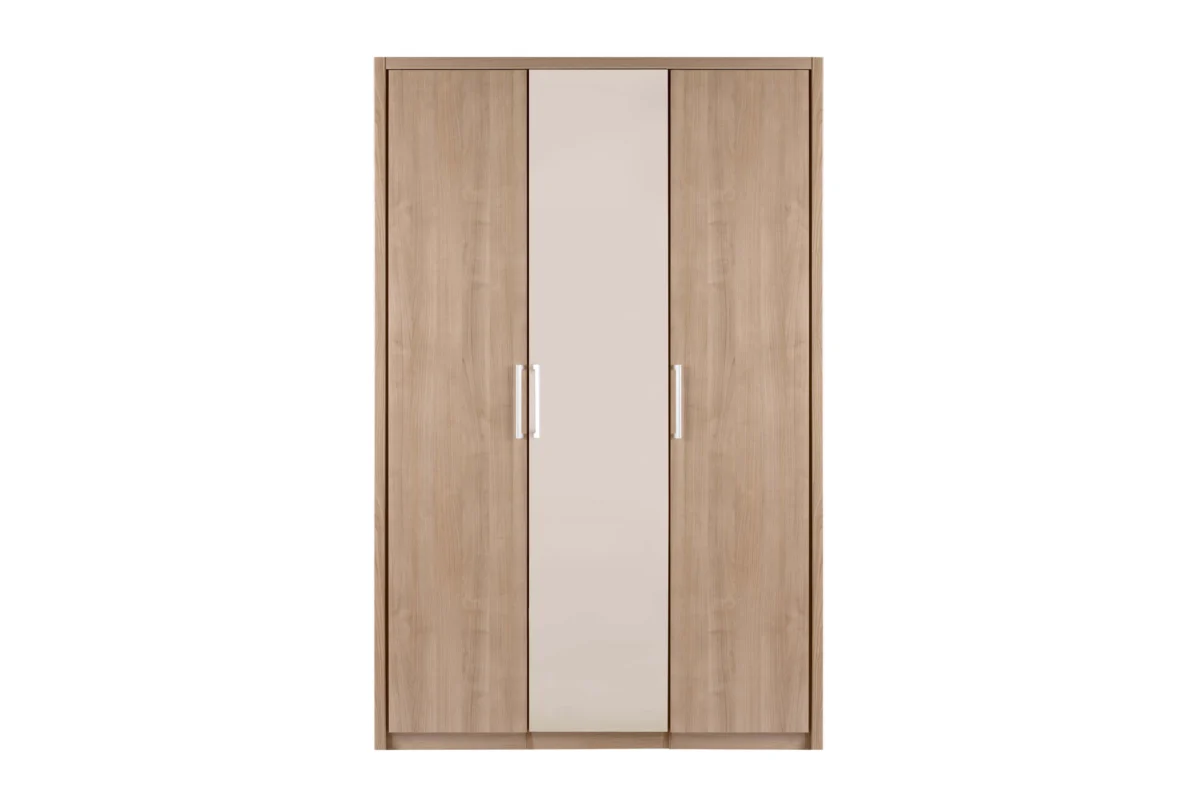 Keln wardrobe measuring 144.3 x 58.6 x 222.7 cm is a three-wing model with a classic door. Inside, there are four separate storage segments along the entire length of the entire vertical. In the second part there is one large shelf for storage and a part with a wardrobe bar.