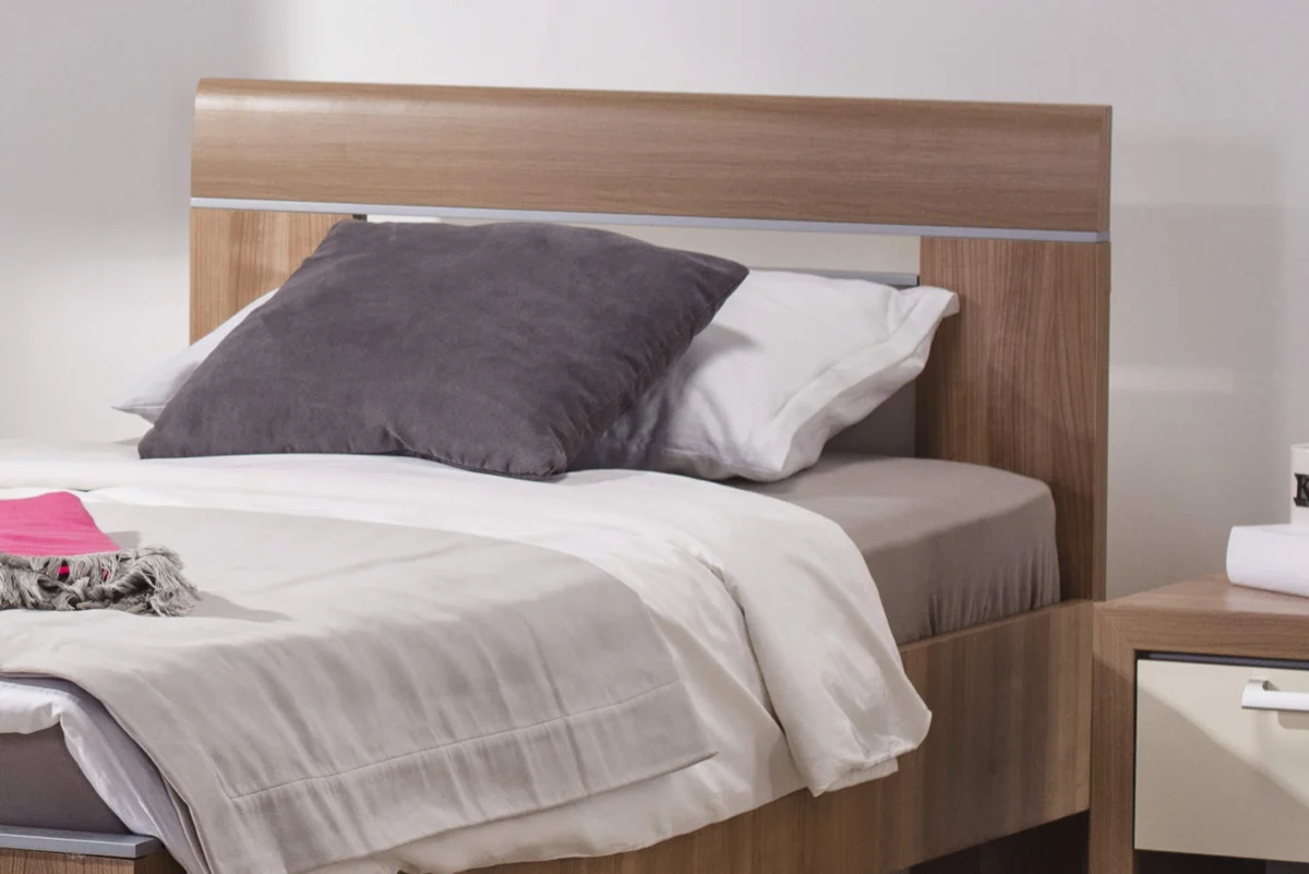 Keln bed is made of melamine chipboard with a headboard that has the addition of profiled MDF in decorative foil. Elegant decorative moldings, as a special detail on the bed, are made of MDF in a silver finish. The headboard height is 85 cm.