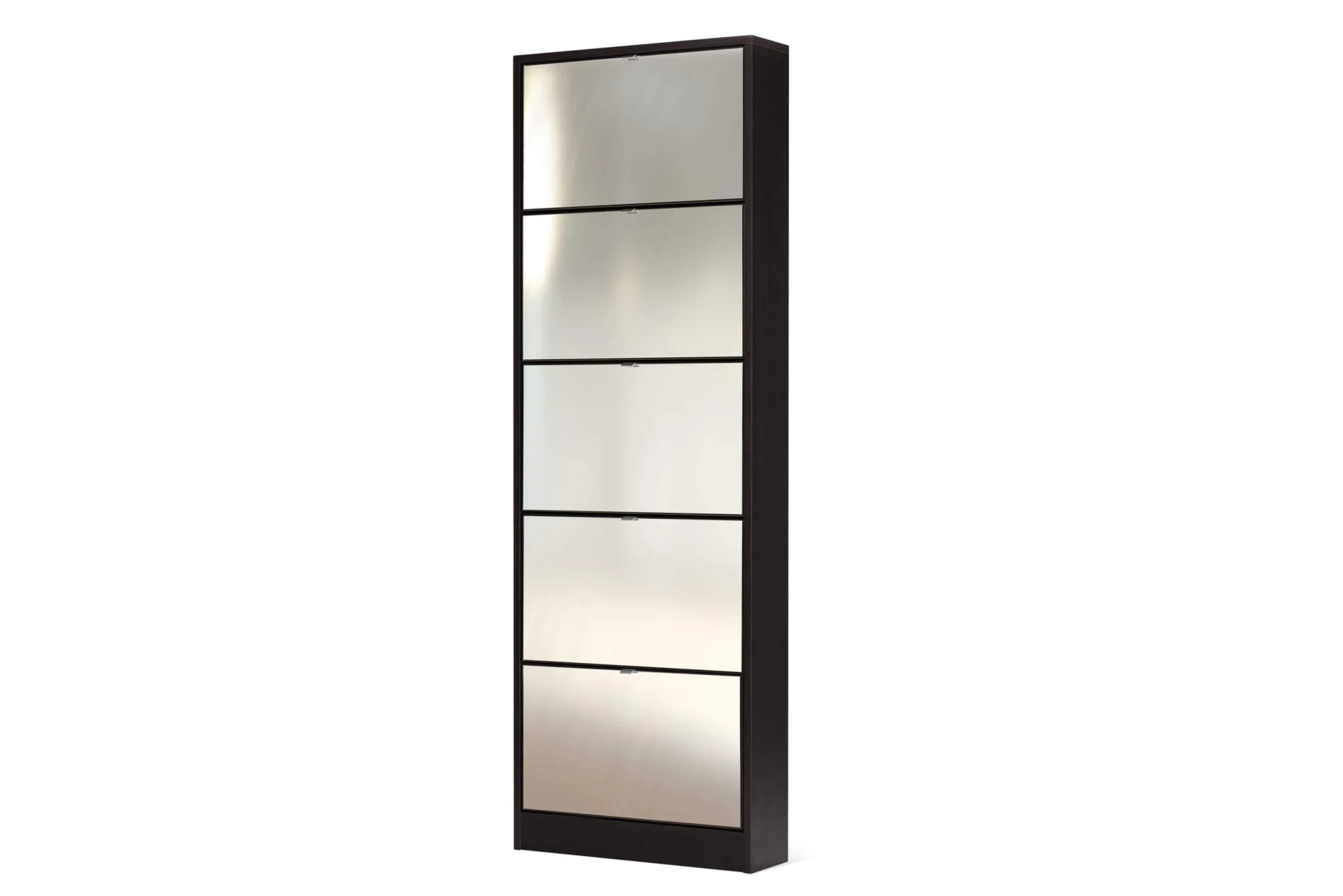 The slim shoe rack measuring 62 x 18 x 183 cm with a mirror is a five-segment model with a sloping door. There is a discreet aluminum handle on the door that serves to open it. There is enough space to easily arrange your shoes and sort them by seasons. It is placed on the floor and attached to the wall. With it, you will make the most of the space because it is tall and narrow. A special benefit are the mirrors on the fronts, which visually enlarge the space and reflect other elements in the hallway.