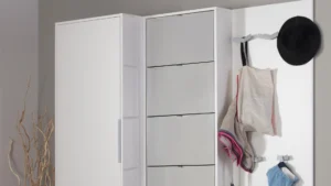 The slim shoe rack is a part of the hall of the same name, which includes a hat stand and a wardrobe with or without mirrors. Elements can be purchased individually and combined as desired.