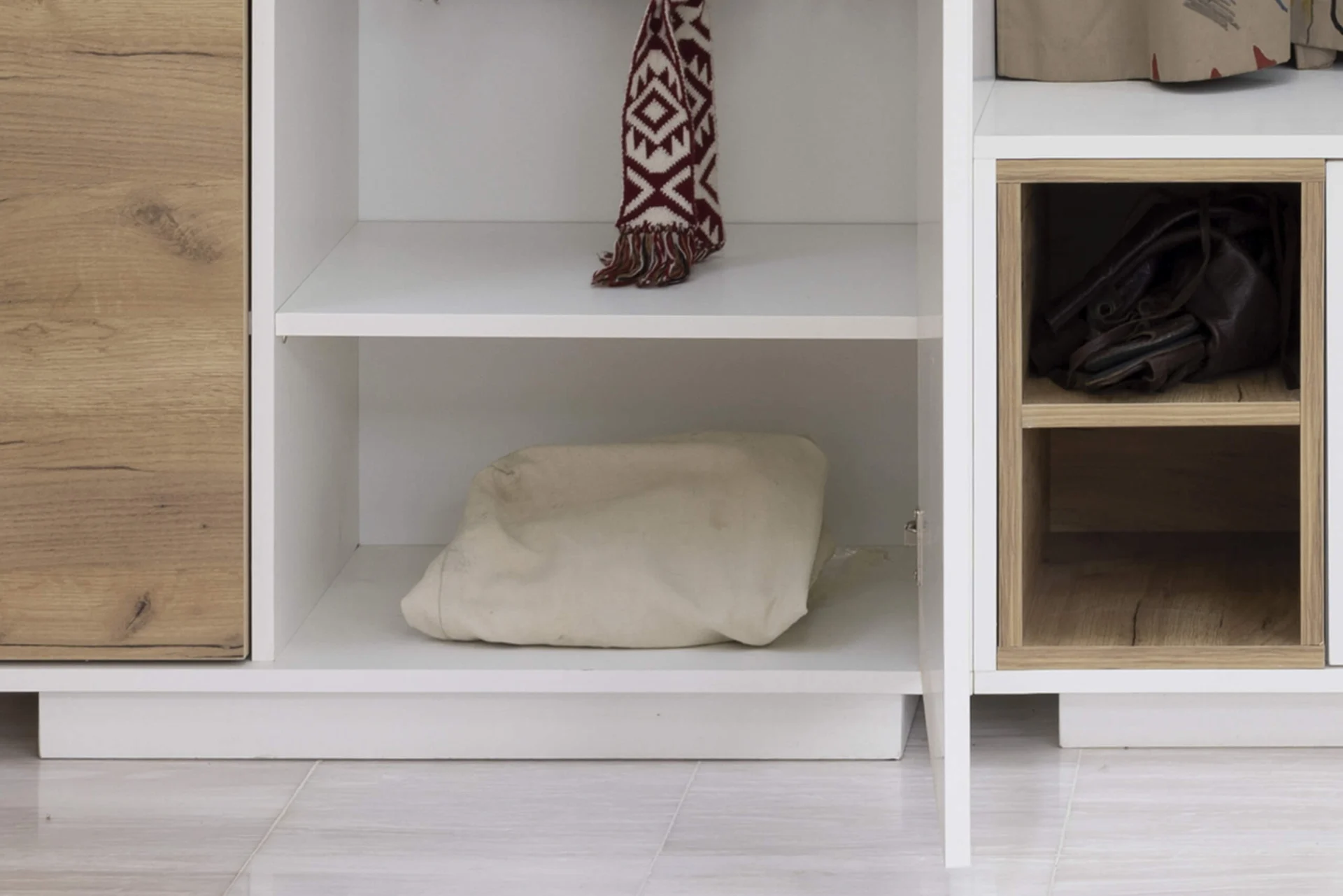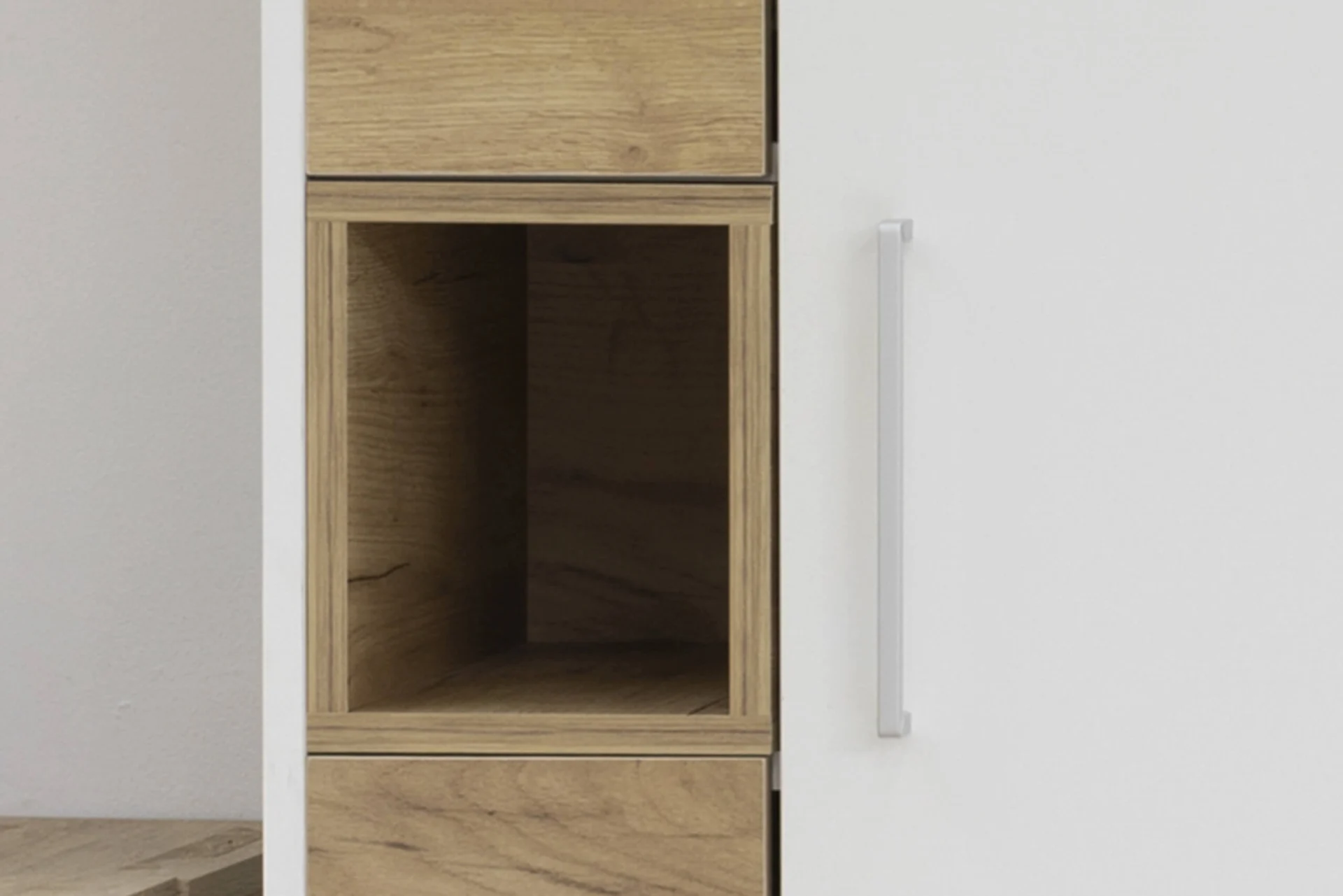 The structure and larger doors of these wardrobes are made of white MFC. The smaller door and the inner box are made of MFC in a golden oak design. The interior is equipped with a telescopic clothes rail for storing clothes, one partition and a shelf. Behind the narrow wardrobe doors that open with a touch, the space is divided into segments suitable for storing shoes. You can use the open segment to store various small items.