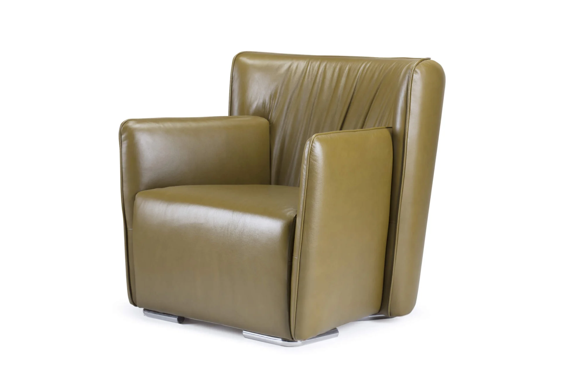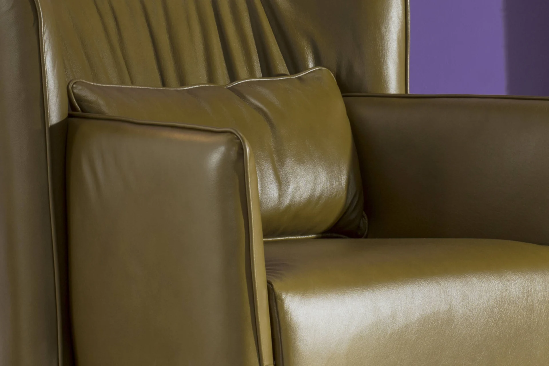 The material for the final production of the Elena armchair also determines the type of legs. The elegant metal legs are installed in the leather armchair. The armchair in fabric rests on solid wood legs.