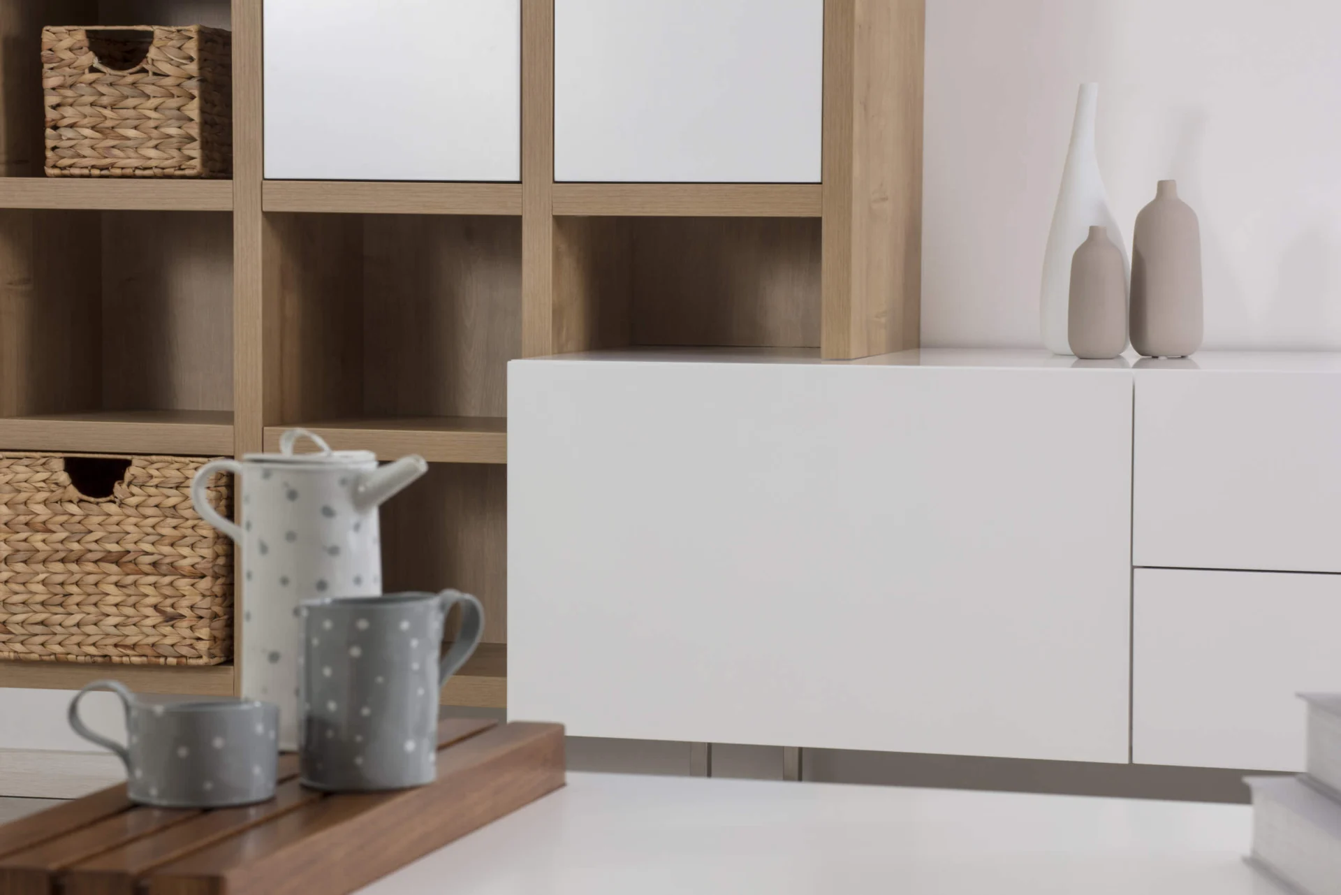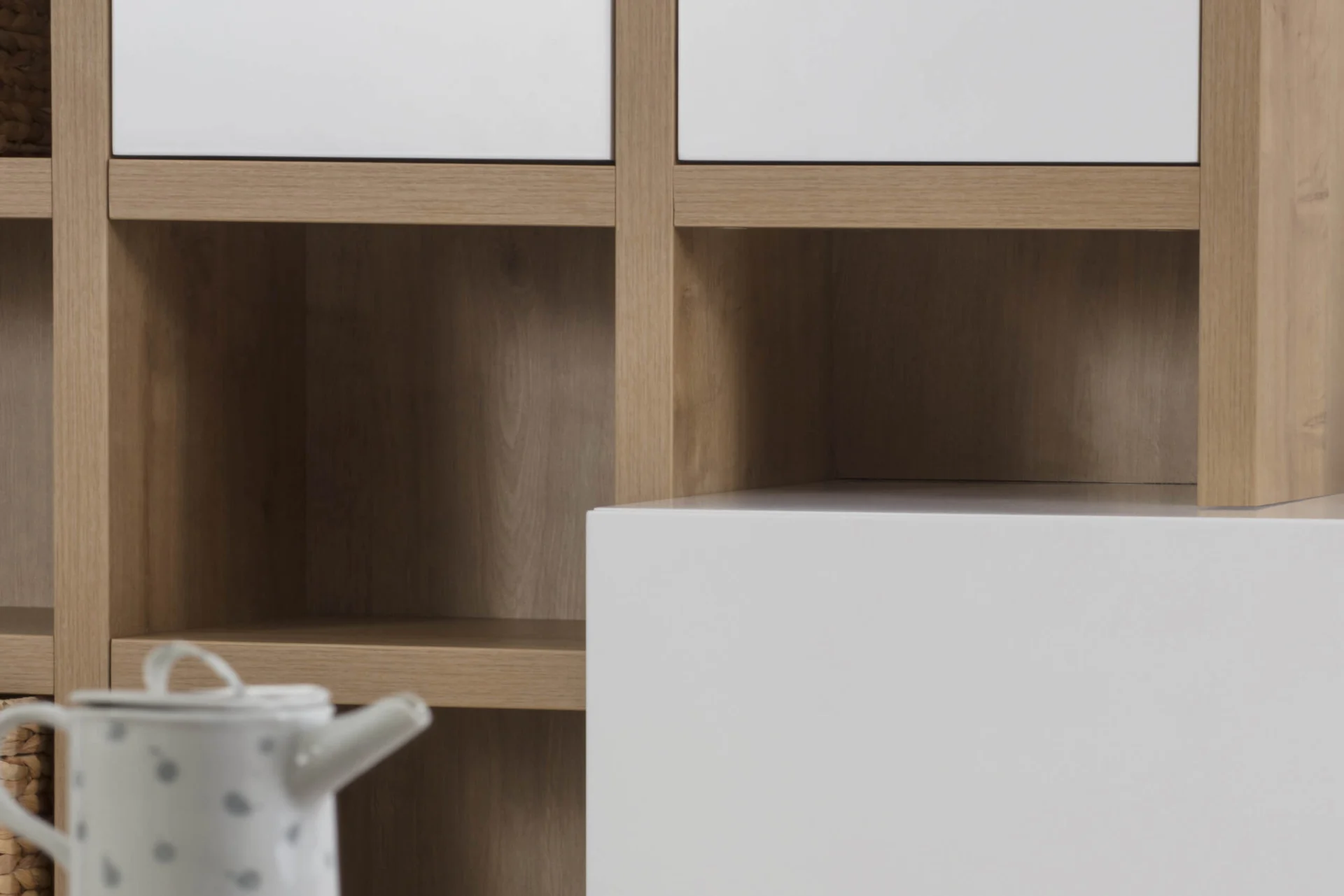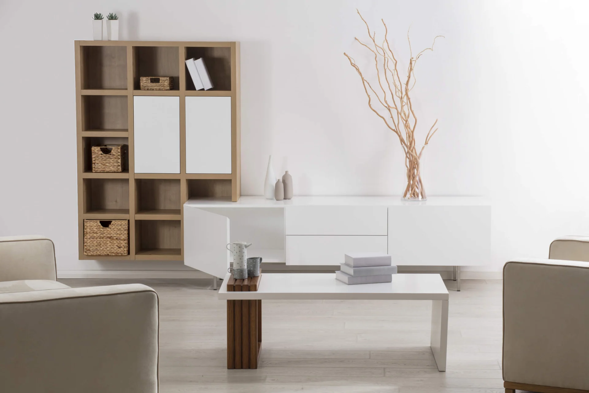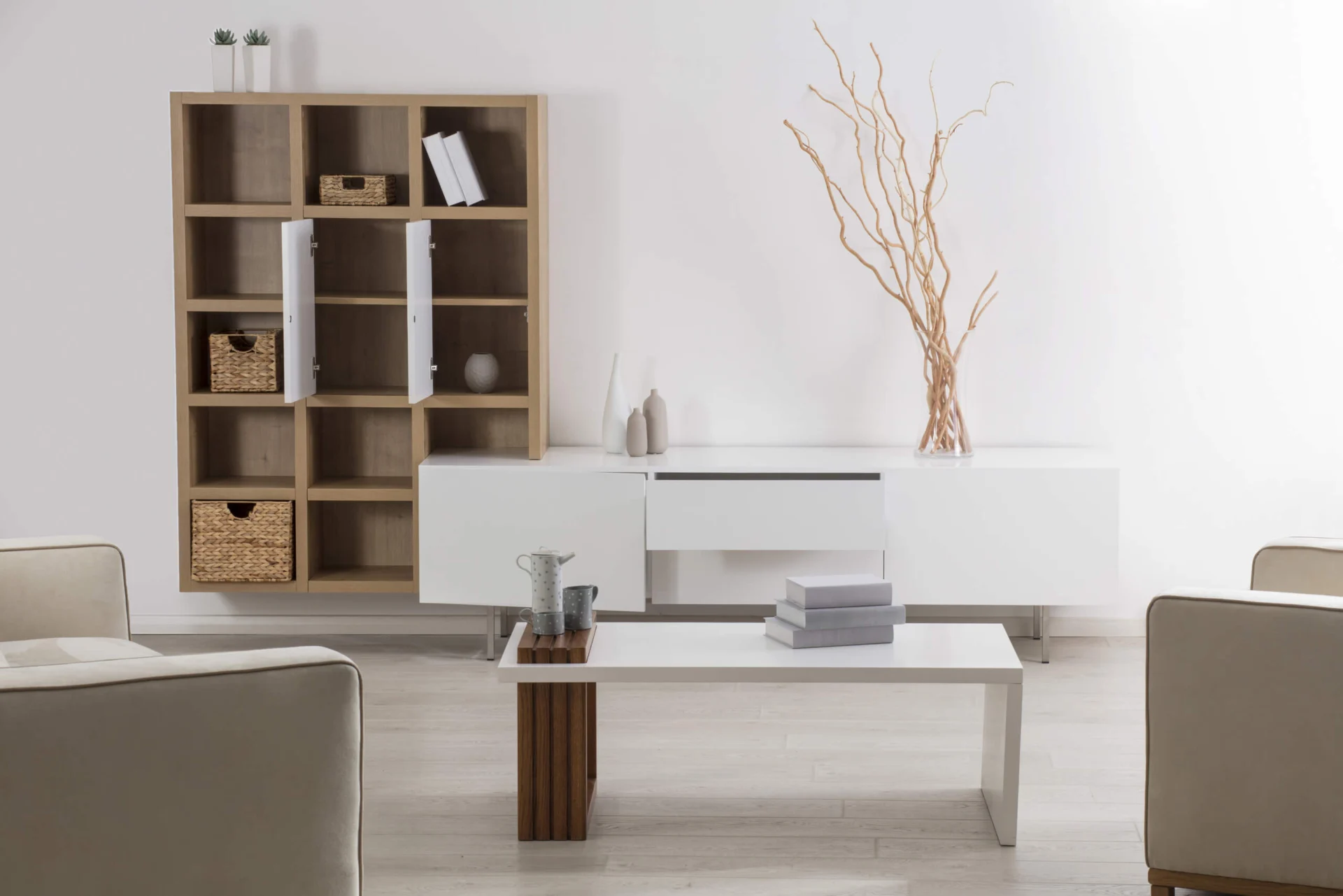 Kasia integrates a dresser and a large wall shelf and is a modern solution for arranging the living room. It is designed to make the organization of things easier in your living space.