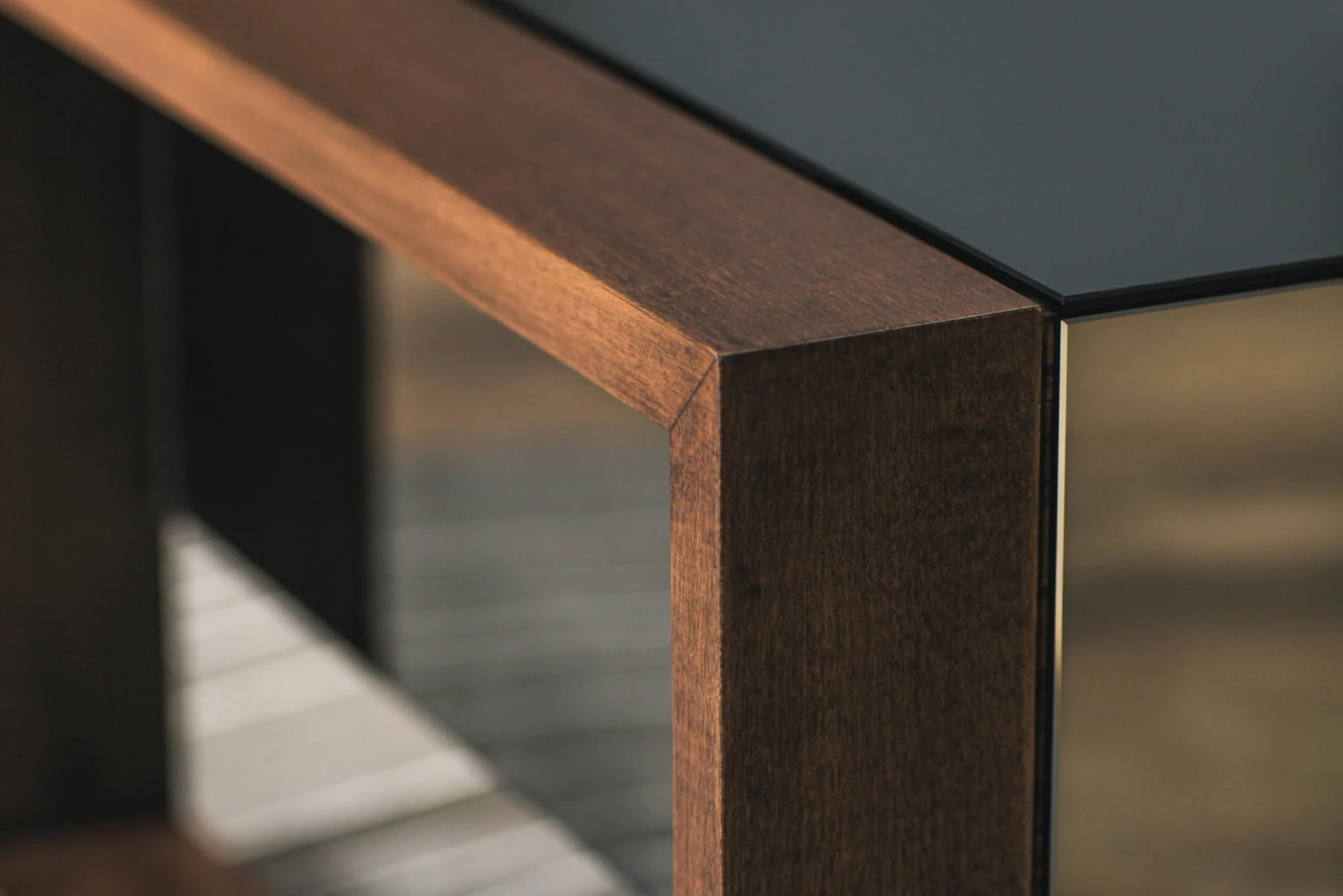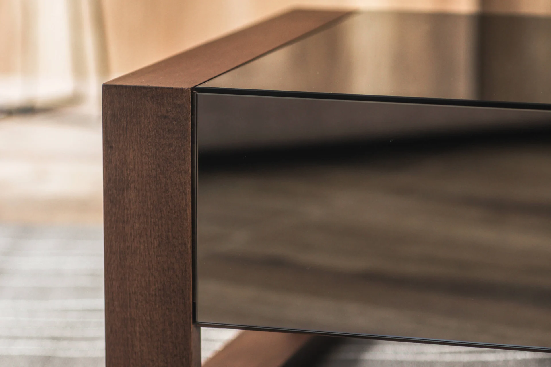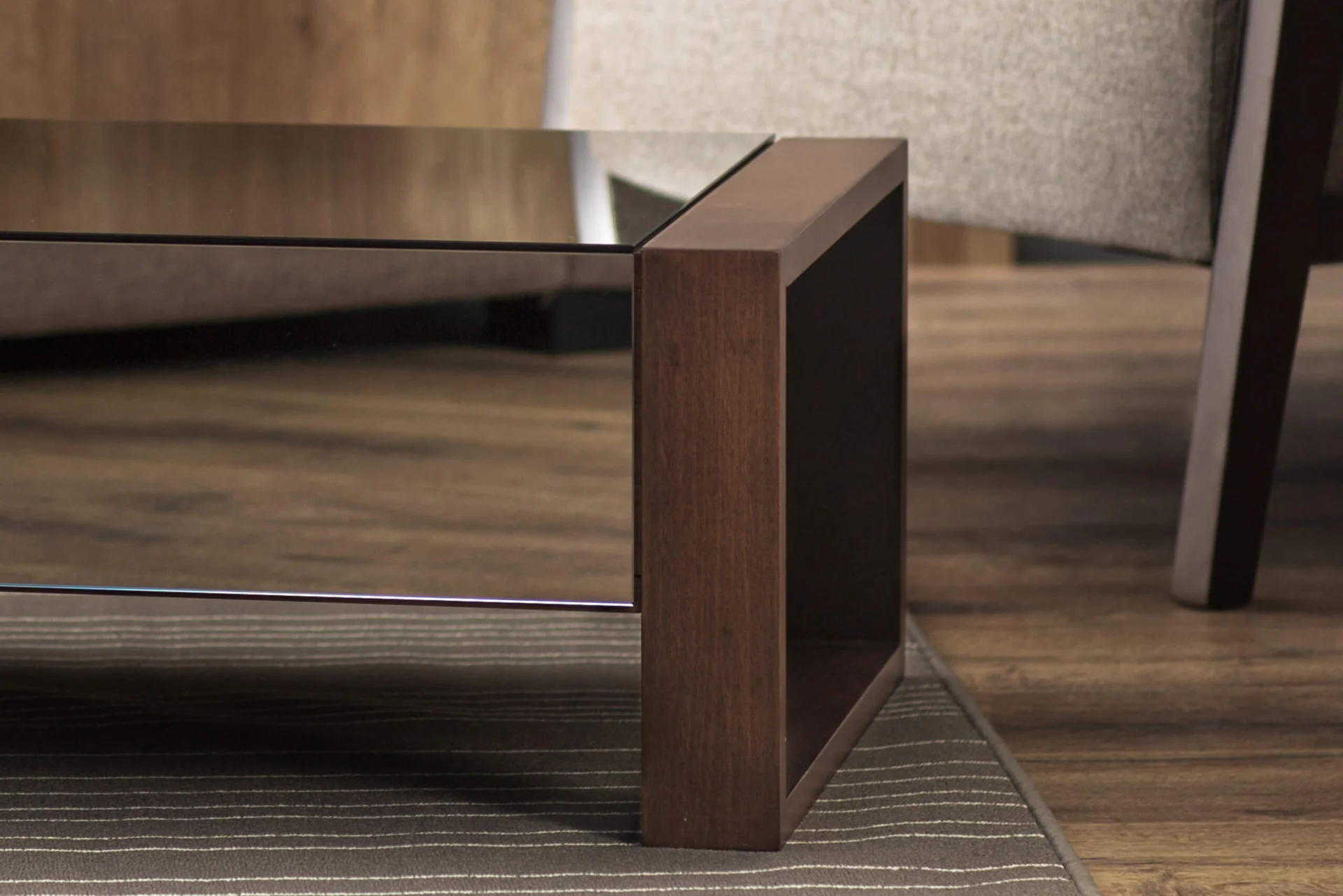 This club table of rectangular shapes covered with a tinted mirror that subtly reflects light, is a perfect decorative piece of furniture. Combined with chocolate-colored solid beech wood legs, it ennobles and makes your space unusual.