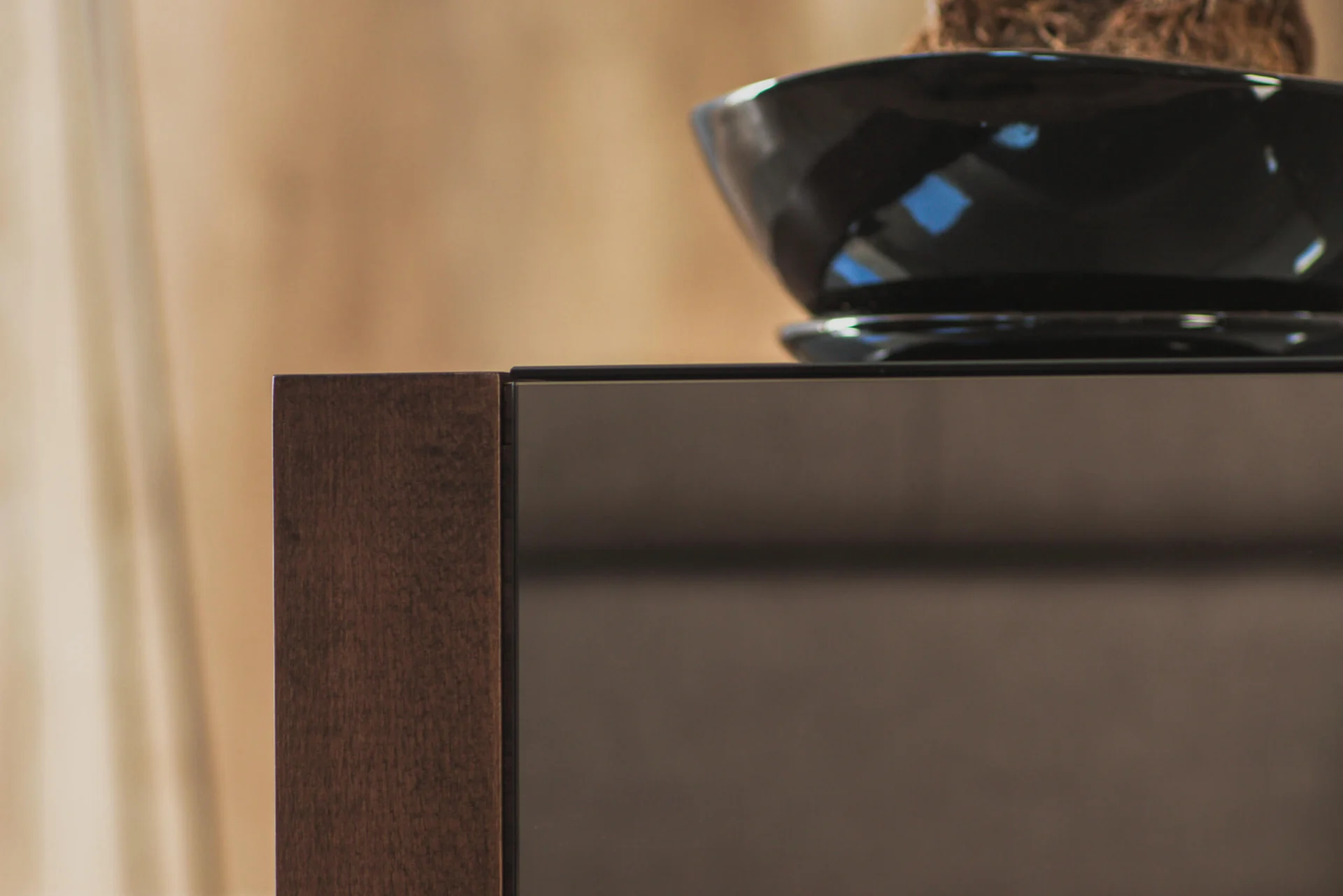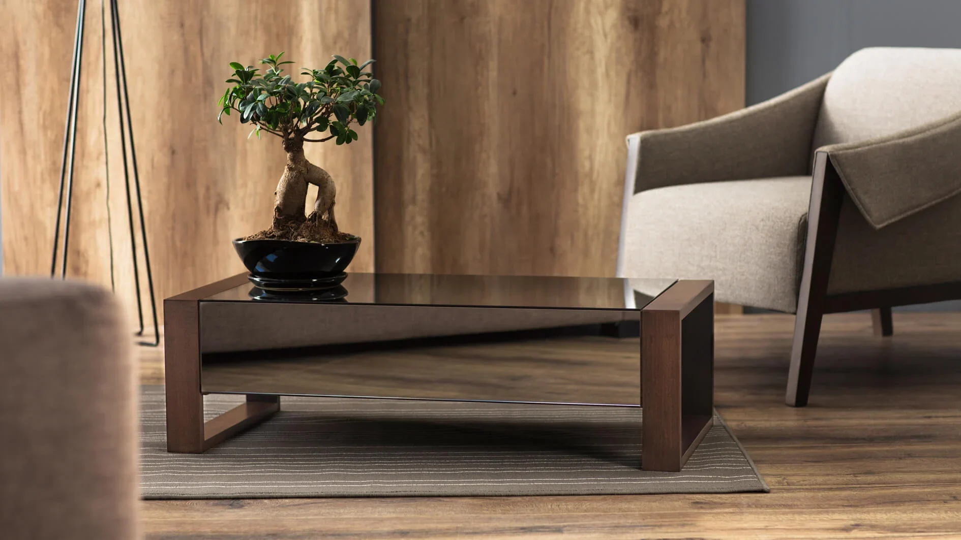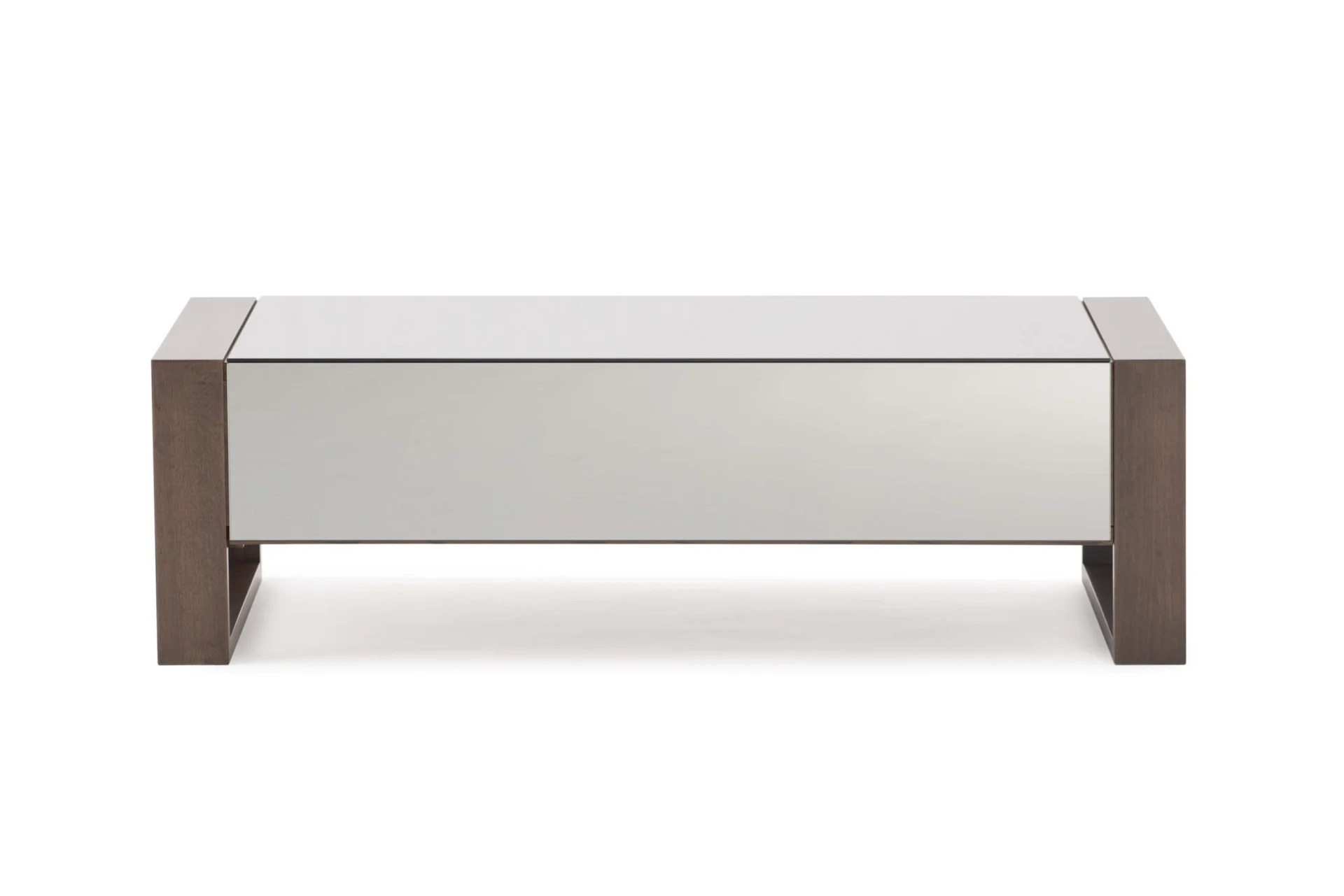 This club table of rectangular shapes covered with a tinted mirror that subtly reflects light, is a perfect decorative piece of furniture. Combined with chocolate-colored solid beech wood legs, it ennobles and makes your space unusual.