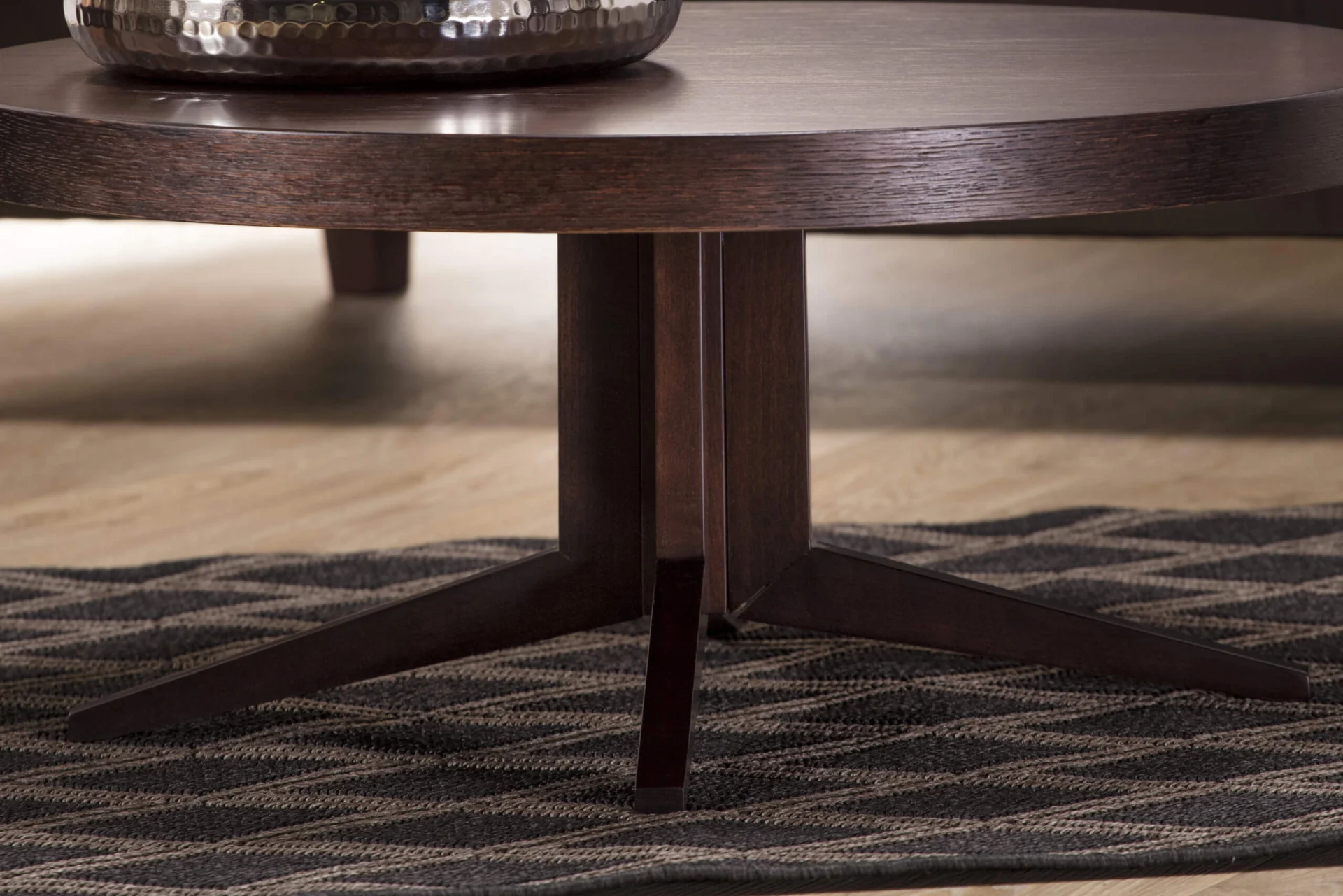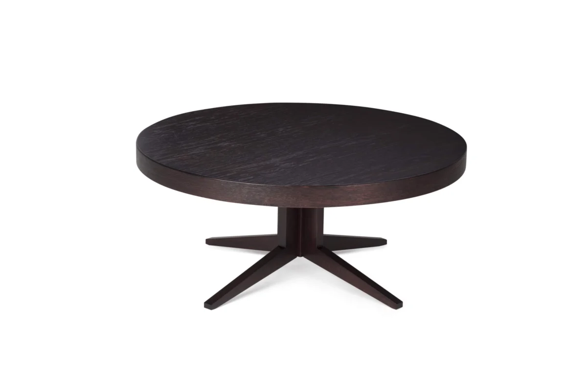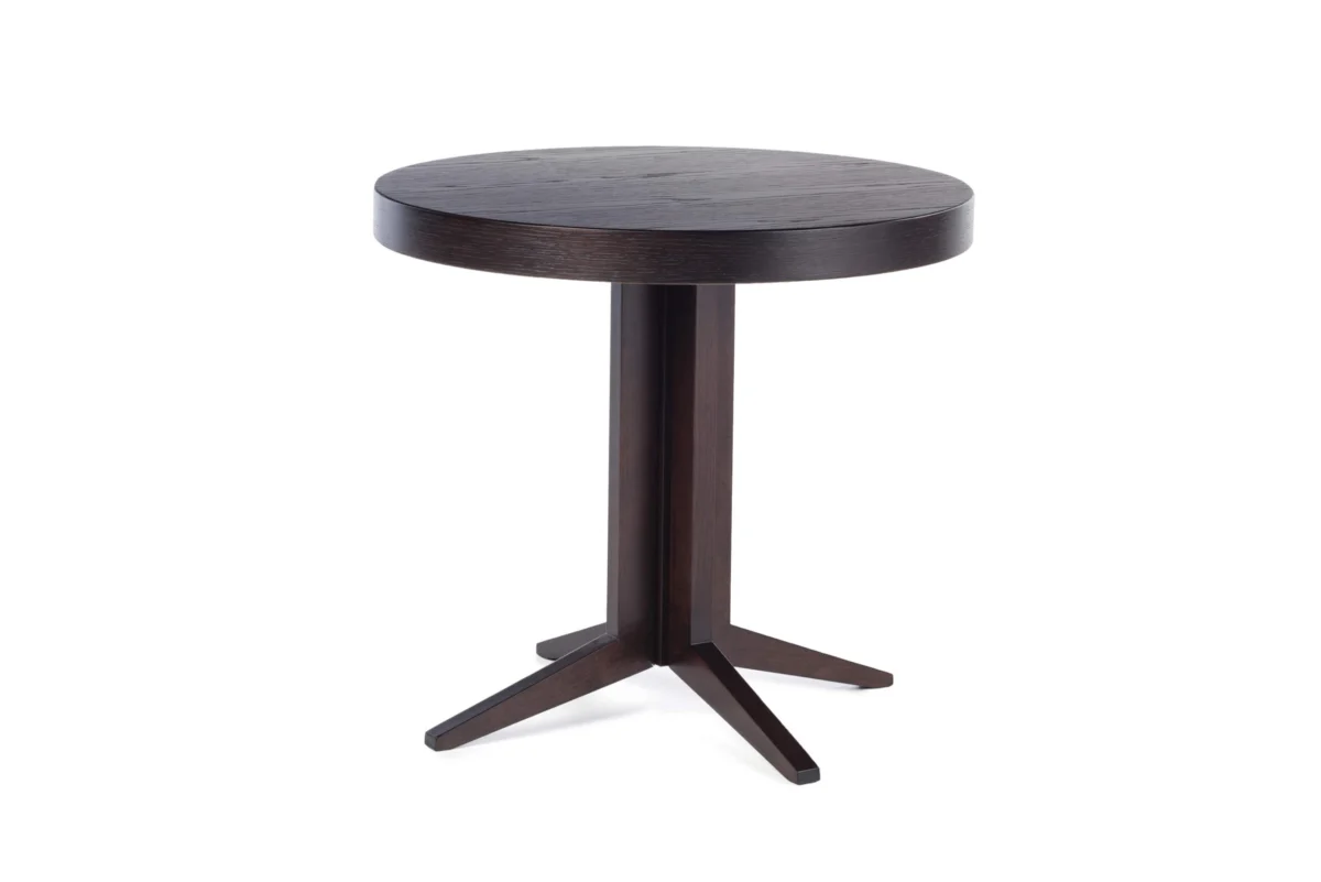 The Lira club table with a circular plate has an elegant solid wood leg with four feet.