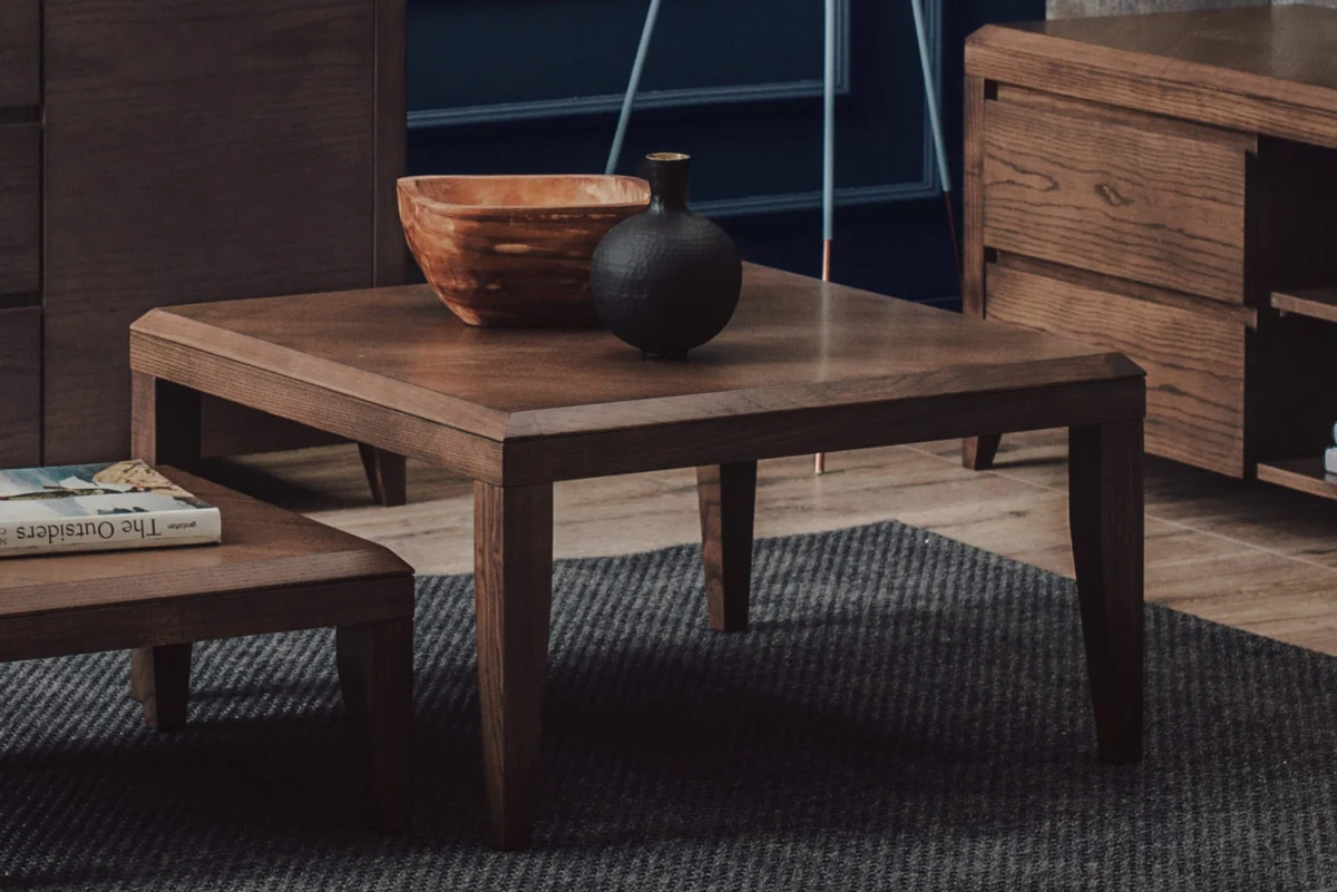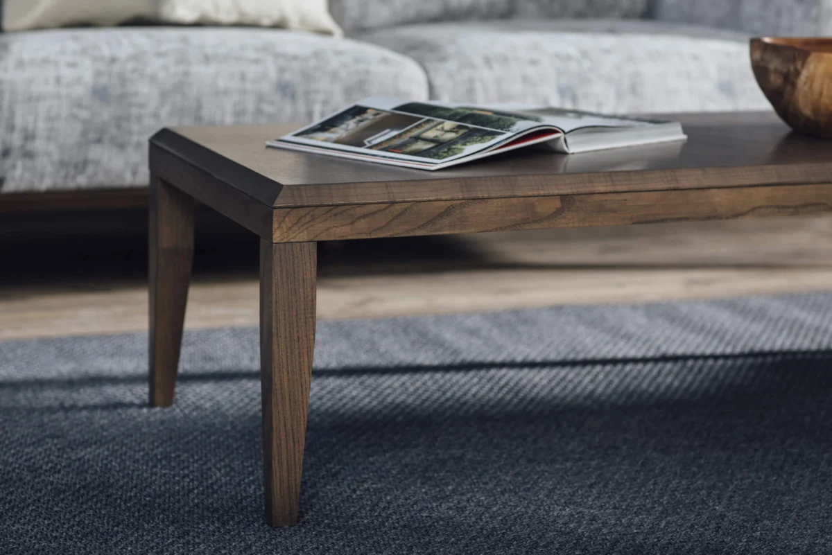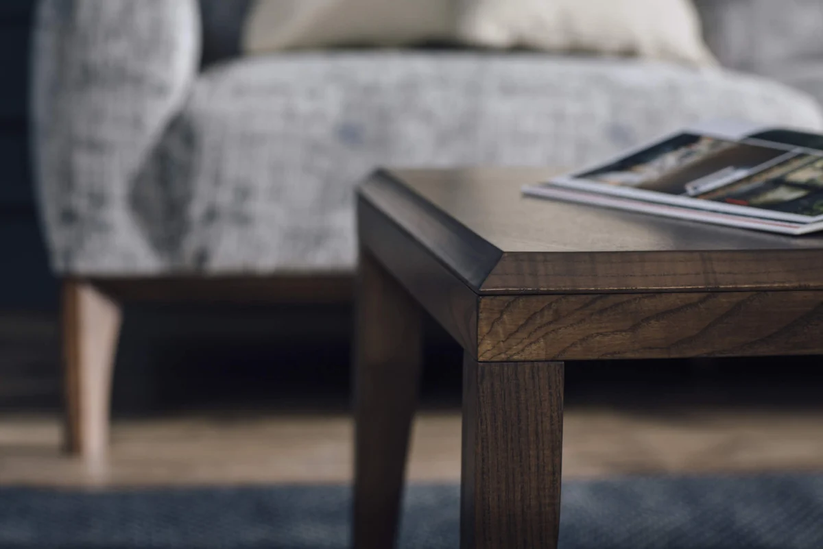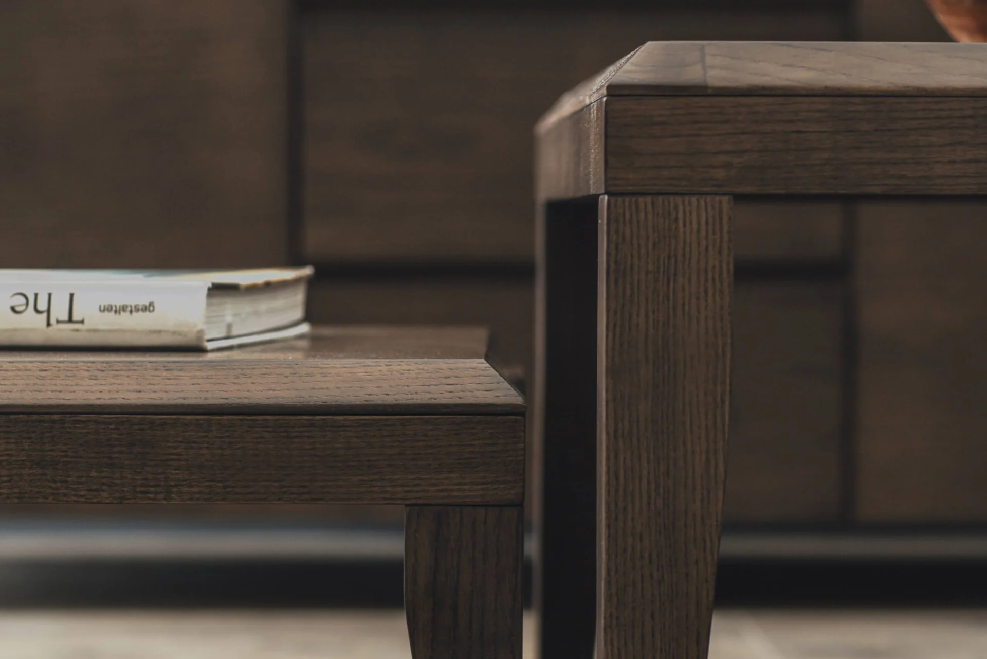 The legs of the Safira club table are made of solid ash. Particleboard with massive ash edgings, veneered in ash veneer. The finish in a tone of dark oak gives an extremely elegant character to this model.