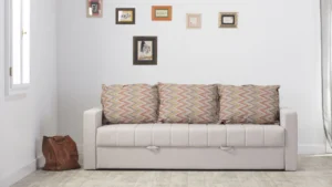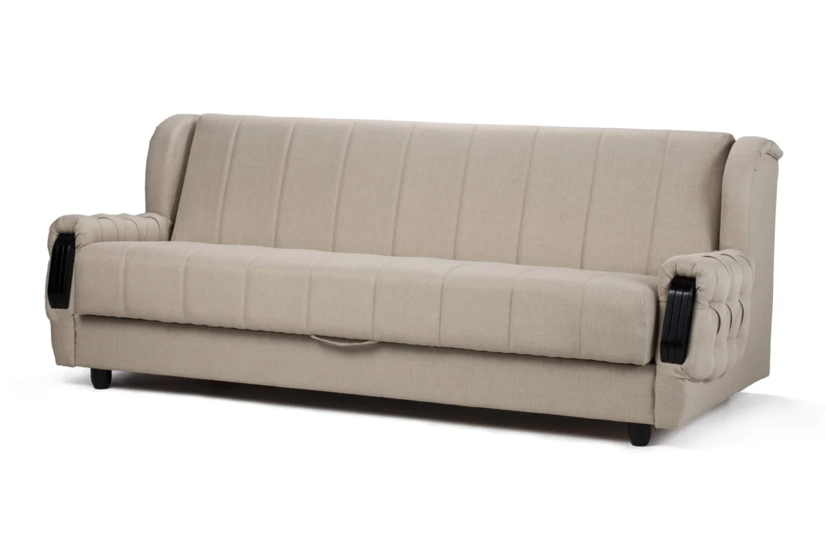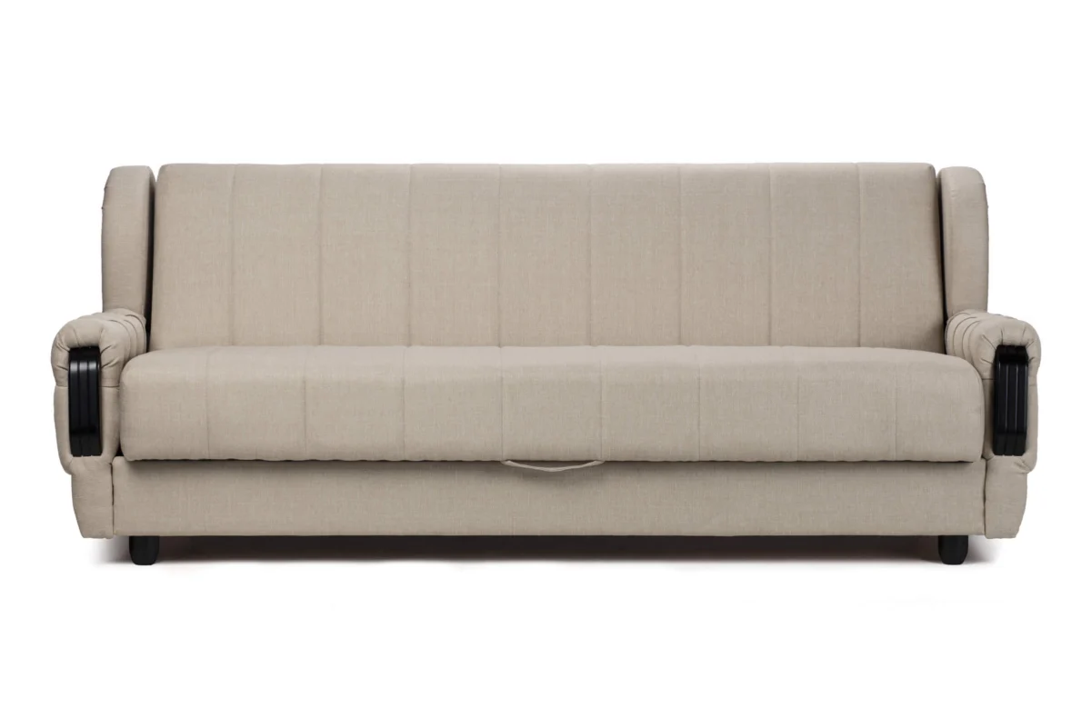 It has a simple design with elegant stitches. There are solid armrests with decorative rivets on its sides, decorated with solid wood profiles. The construction of the couch is made of beech wood, chipboard and MDF. You can use this sofa for a long time in the living room or guest room, enjoying all the benefits it provides.