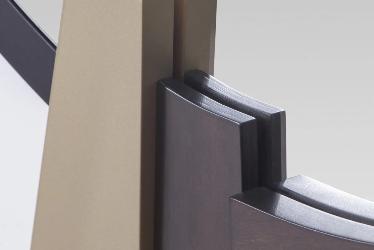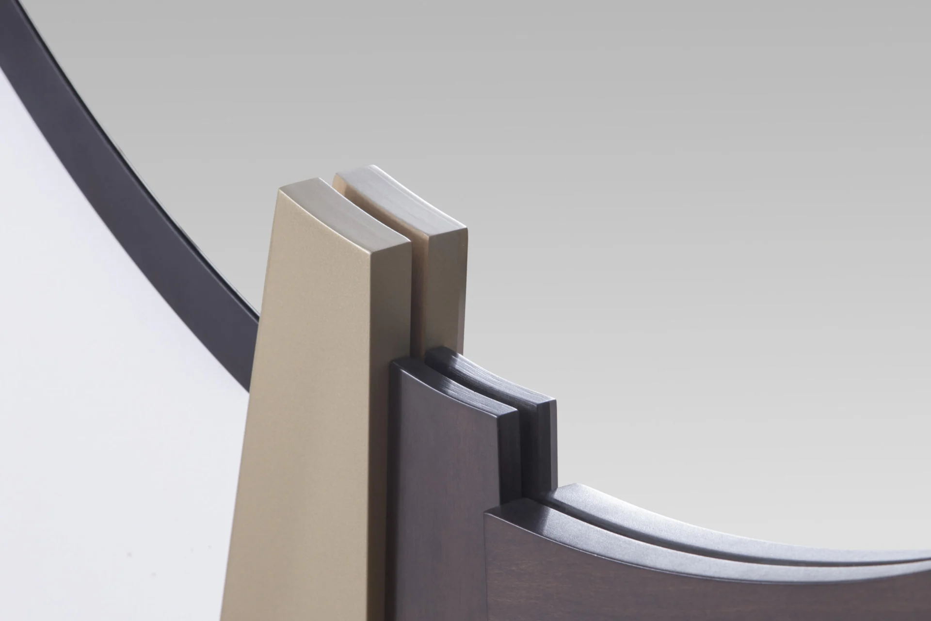 The Krug mirror frame is made of melamine MDF in matte black. Wooden segments of interesting shapes and unusual arrangement on the frame are made of solid linden in black, brown and gold color. There is a 4 mm thick mirror on the MDF base.