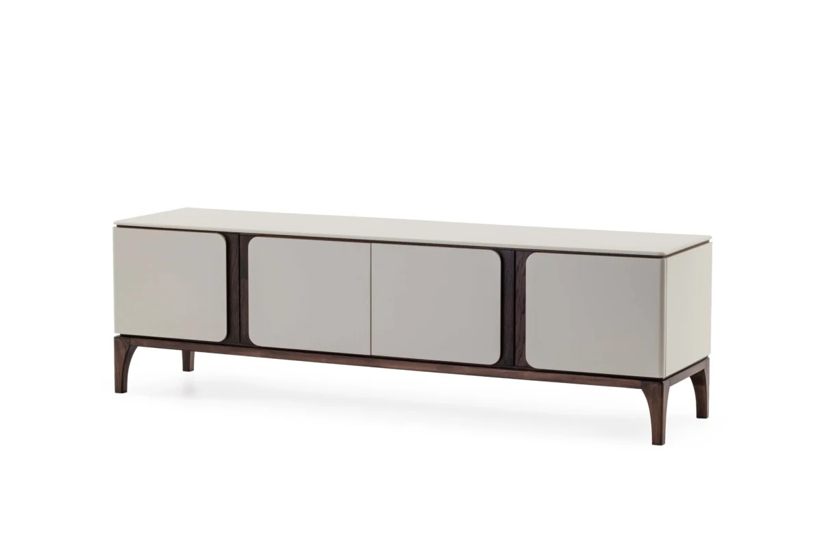The sides of this TV set are made of white melamine chipboard and finished with PU varnish, in the tone of Bianco pearl. The panel and door fronts are made of MDF in the same tone. Instead of handles, Alora has an interesting design solution for opening and closing the door on the dresser, made of veneered MDF in dark walnut color. The frame and legs of the stand are made of solid beech, also in dark walnut.