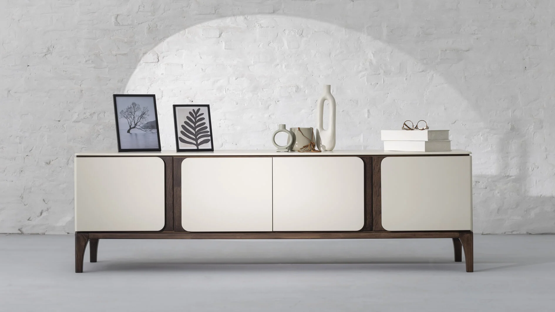 An interesting combination of melamine chipboard, MDF and solid wood in contrasting tones of dark walnut and Bianco pearl tone, creates a modern look suitable for different furnishing styles.