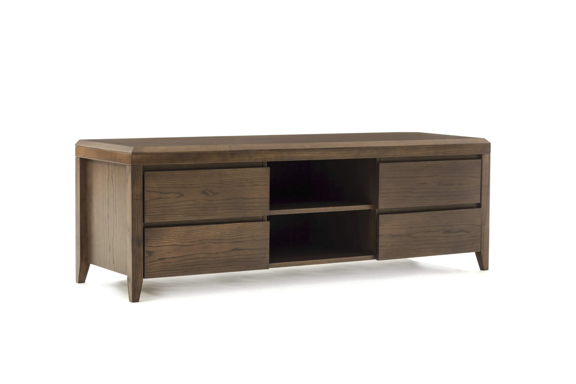 Safira TV stand 4 drawers, in the dimensions of 160 x 50 x 54 cm, has four drawers and one open segment in the middle, which is divided into two parts by a shelf.