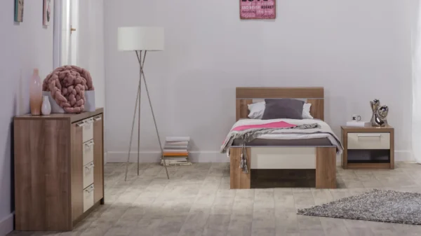 Keln children’s room is a classic model in the combination of cherry and beige patterns, equally suitable for girls’ and boys’ rooms. The composition combines a double-wing wardrobe with classic and sliding doors, a bed, a dresser, a mirror, a desk and a bedside table. It is furniture that will meet your child’s needs for good rest, learning and creative activities.