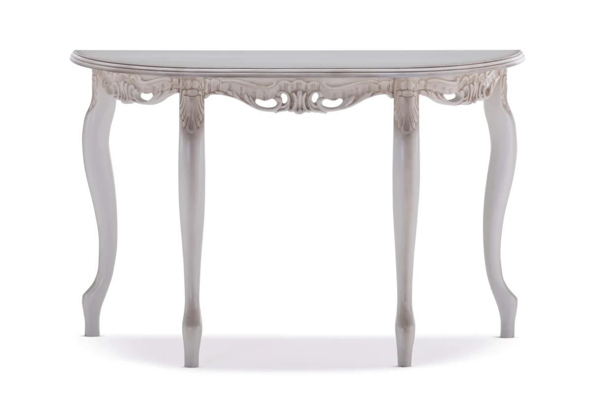 Viktorija konzola ima ploču od belog oplemenjenog medijapana, sa završnom obradom u beloj mat boji. Rubovi su profilisani i senčeni. Valovite noge od punog bukovog drveta, takođe su profilisane i senčene. Konzola je delo najfinije ručne dorade.