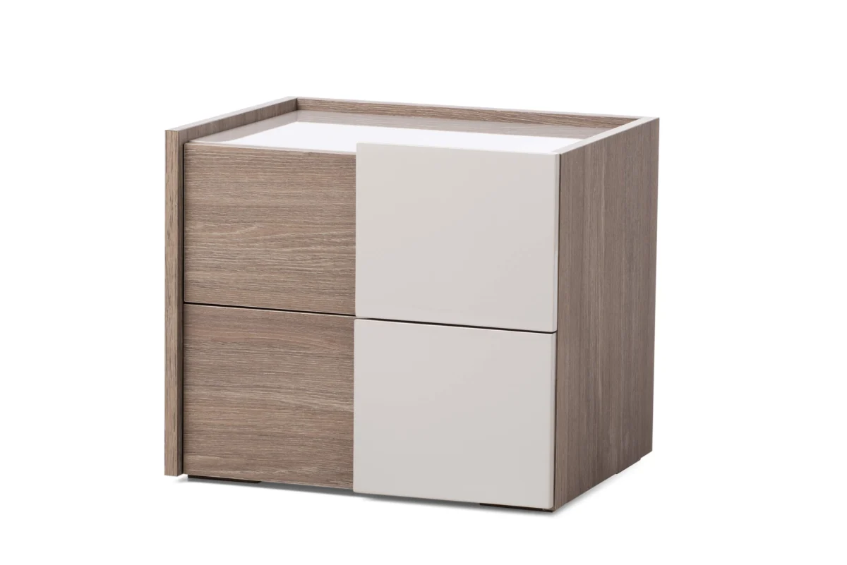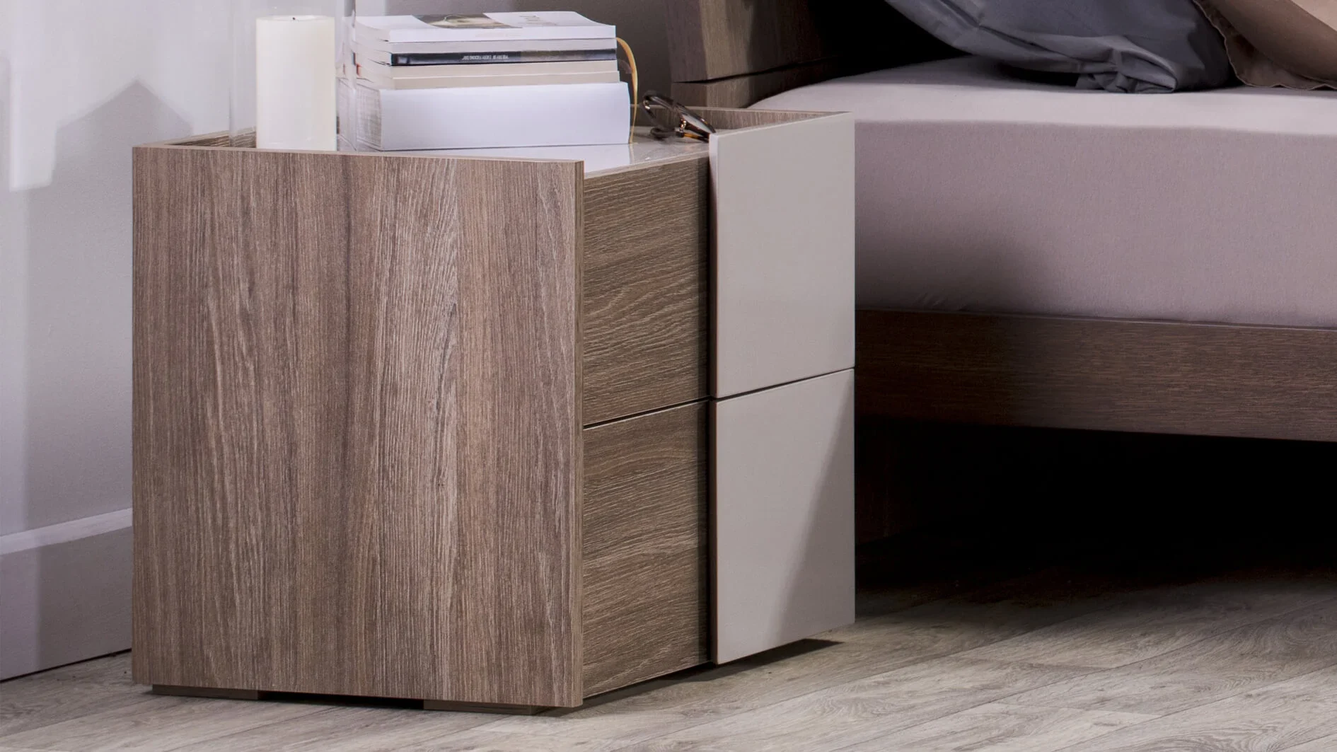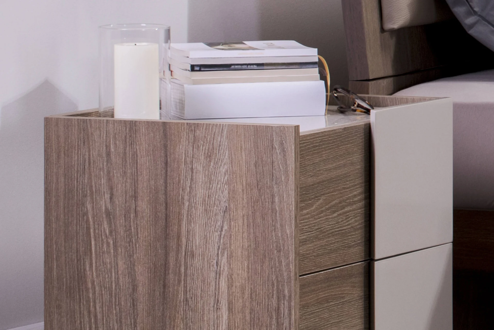 Stranice i front na ovom modelu proizvode se od oplemenjene iverice u dezenu sonoma tamnog hrasta. Ploča na noćnom stočiću i specijalno dizajniran dodatak na prednjem delu fioka, koji predstavlja ne samo zanimljivo dizajnersko rešenje već ima i praktičnu ulogu kod otvaranja i zatvaranja noćnog stočića, napravljeni su bele oplemenjene iverice sa završnom obradom u tonu kapućino mat.
