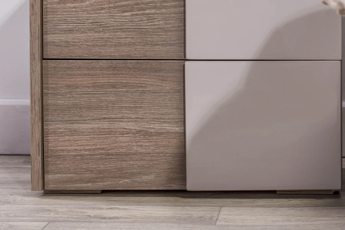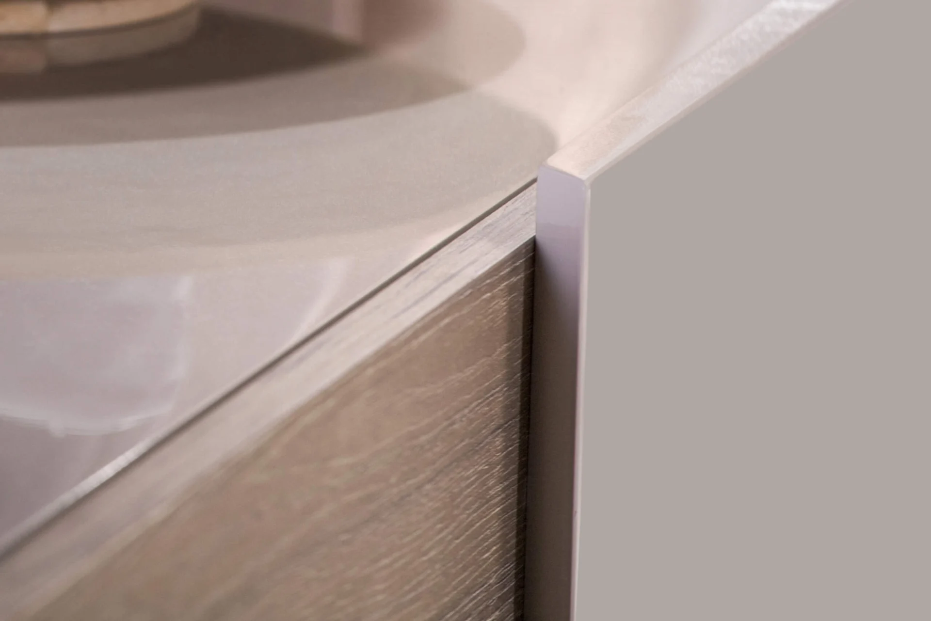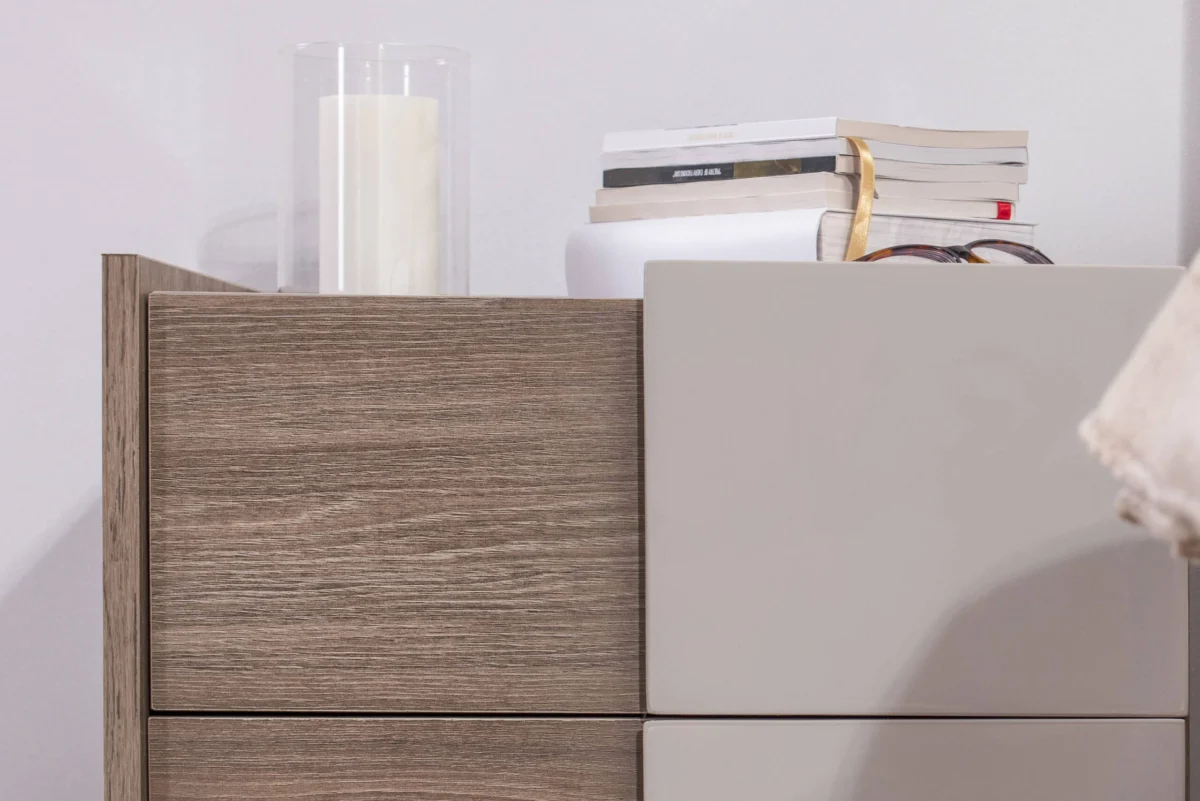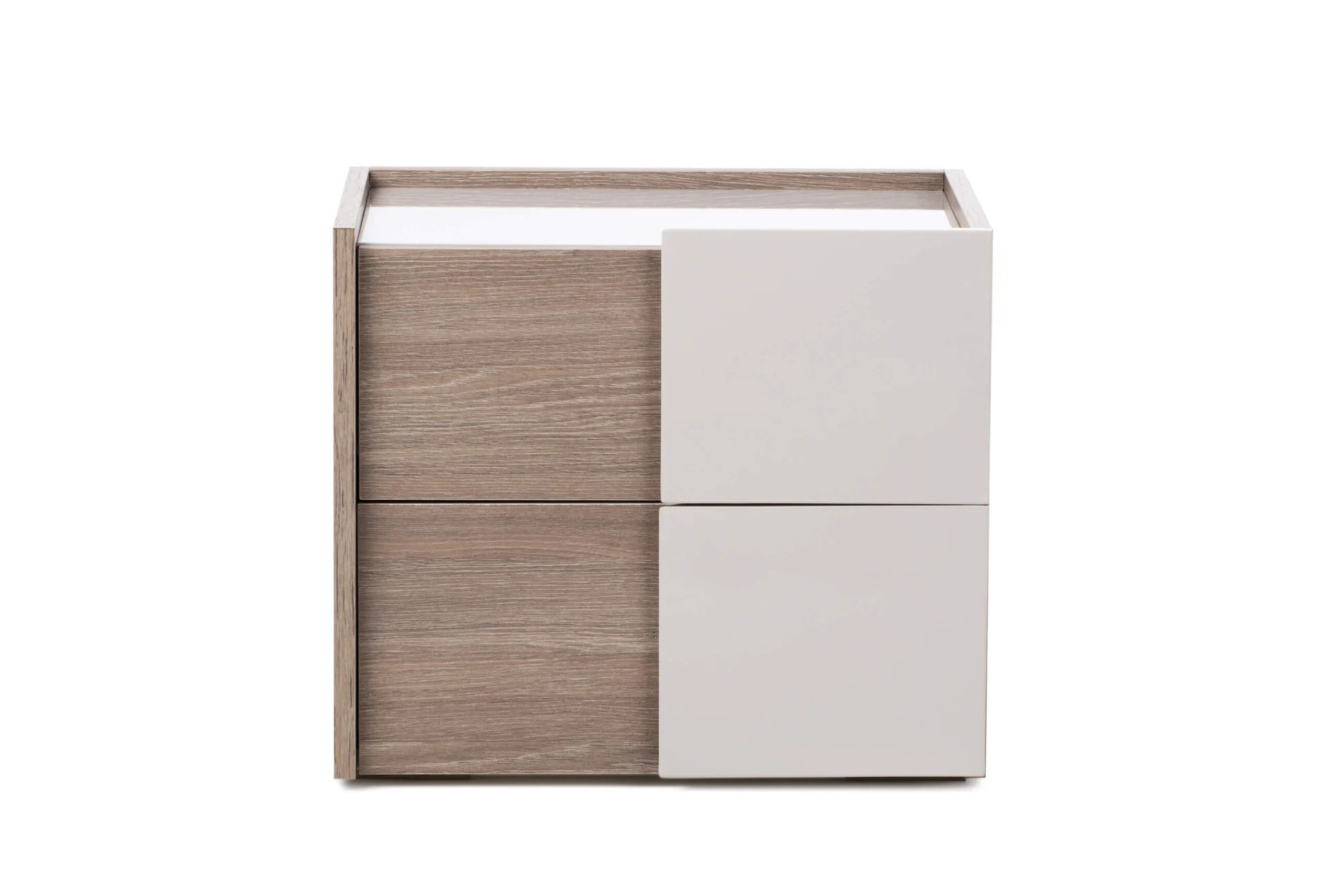Stranice i front na ovom modelu proizvode se od oplemenjene iverice u dezenu sonoma tamnog hrasta. Ploča na noćnom stočiću i specijalno dizajniran dodatak na prednjem delu fioka, koji predstavlja ne samo zanimljivo dizajnersko rešenje već ima i praktičnu ulogu kod otvaranja i zatvaranja noćnog stočića, napravljeni su bele oplemenjene iverice sa završnom obradom u tonu kapućino mat.
