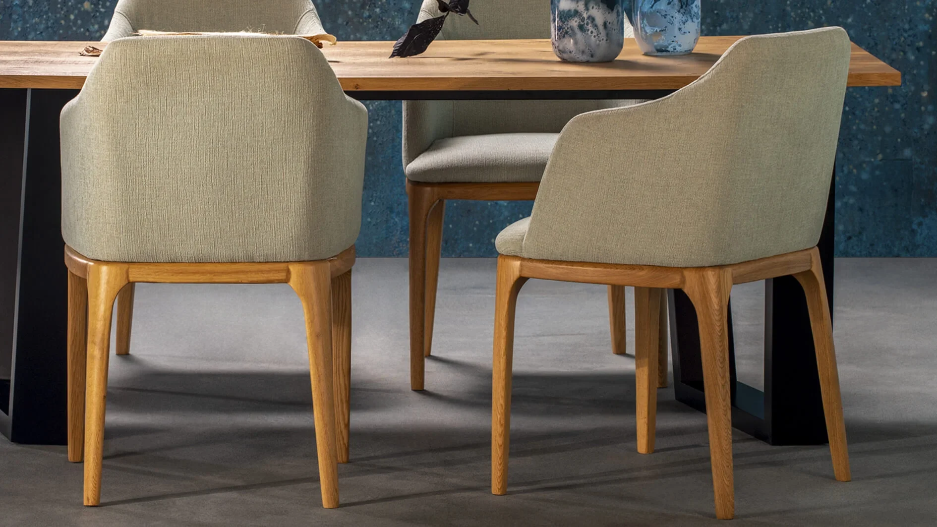 Finalni izgled Stefany trpezarijske stolice prepušten je vama. Imate mogućnost da izaberete neki od štofova i koža iz naše aktuelne ponude, kao i ton drveta i tako je prilagodite vašim željama.